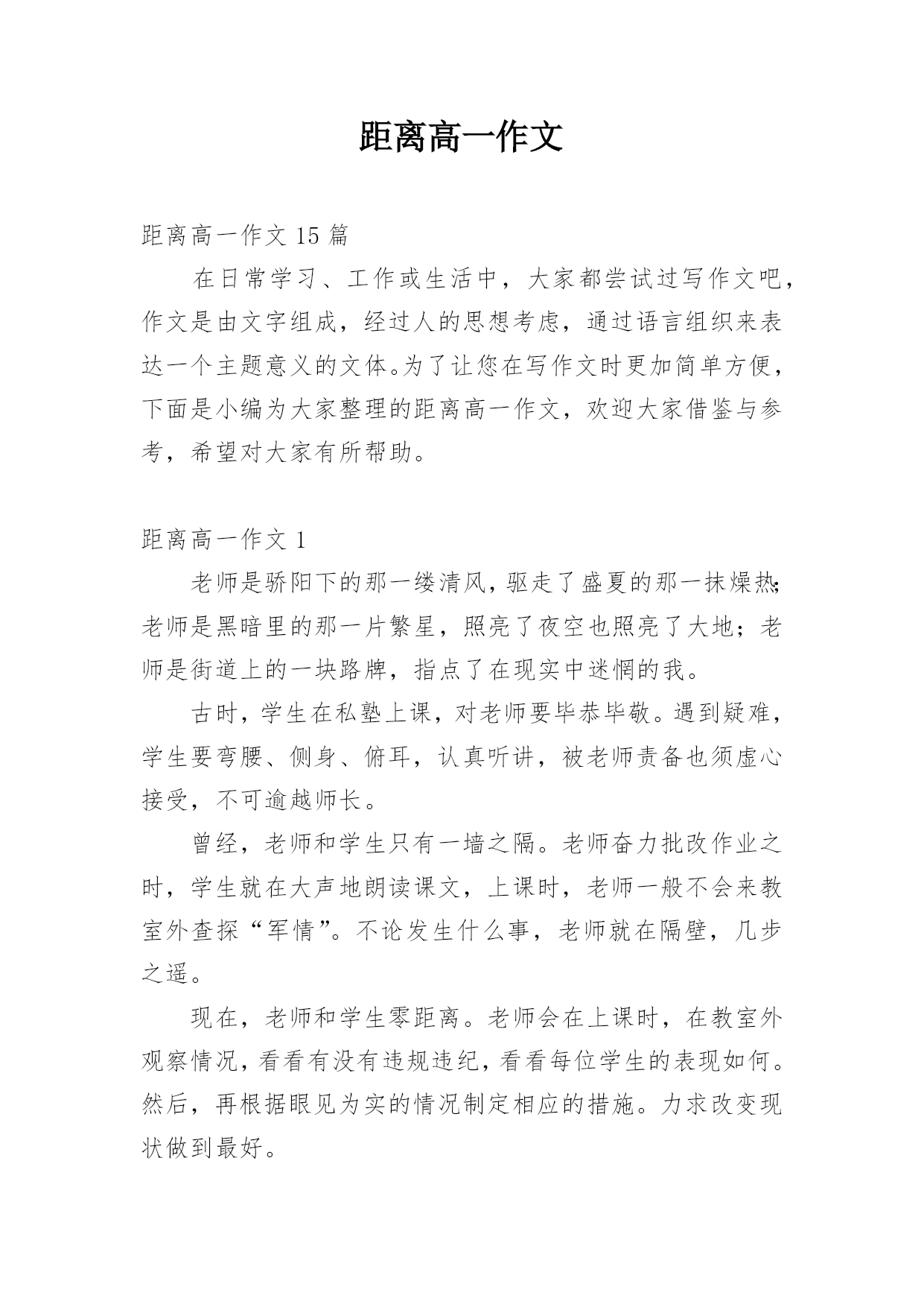 距离高一作文距离高一作文15篇在日常学习、工作或生活中,大家都尝试过写作文吧,作文是由文字组成,经过人的思想考虑,通过语言组织来表达一个主题意义的文体。为了让您在写作文时更加简单方便,下面是小编为大家整理的距离高一作文,欢迎大家借鉴与参考,希望对大家有所帮助。距离高一作文1老师是骄阳下的那一缕清风,驱走了盛夏的那一抹燥热;老师是黑暗里的那一片繁星,照亮了夜空也照亮了大地;老师是街道上的一块路牌,指点了在现实中迷惘的我。古时,学生在私塾上课,对老师要毕恭毕敬。遇到疑难,学生要弯腰、侧身、俯耳,认真听讲,被老