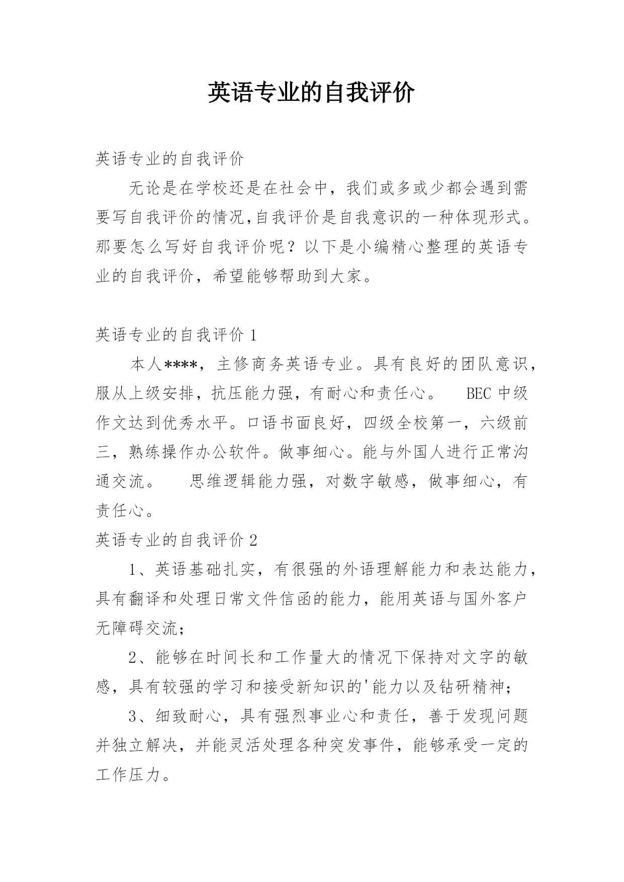 英语专业的自我评价英语专业的自我评价无论是在学校还是在社会中,我们或多或少都会遇到需要写自我评价的情况,自我评价是自我意识的一种体现形式。那要怎么写好自我评价呢?以下是小编精心整理的英语专业的自我评价,希望能够帮助到大家。英语专业的自我评价1本人****,主修商务英语专业。具有良好的团队意识,服从上级安排,抗压能力强,有耐心和责任心。BEC中级作文达到优秀水平。口语书面良好,四级全校第一,六级前三,熟练操作办公软件。做事细心。能与外国人进行正常沟通交流。思维逻辑能力强,对数字敏感,做事细心,有责任心。英语