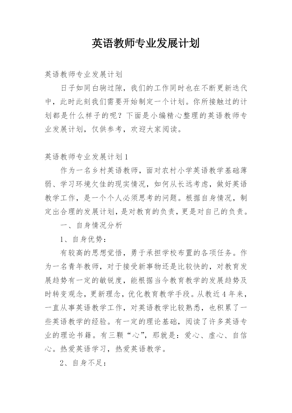 英语教师专业发展计划英语教师专业发展计划日子如同白驹过隙,我们的工作同时也在不断更新迭代中,此时此刻我们需要开始制定一个计划。你所接触过的计划都是什么样子的呢?下面是小编精心整理的英语教师专业发展计划,仅供参考,欢迎大家阅读。英语教师专业发展计划1作为一名乡村英语教师,面对农村小学英语教学基础薄弱、学习环境欠佳的现实情况,如何从长远考虑,做好英语教学工作,是一个个人必须思考的问题。根据自身情况,制定出合理的发展计划,是对教育的负责,更是对自己的负责。一、自身情况分析1、自身优势:有较高的思想觉悟,勇于承担
