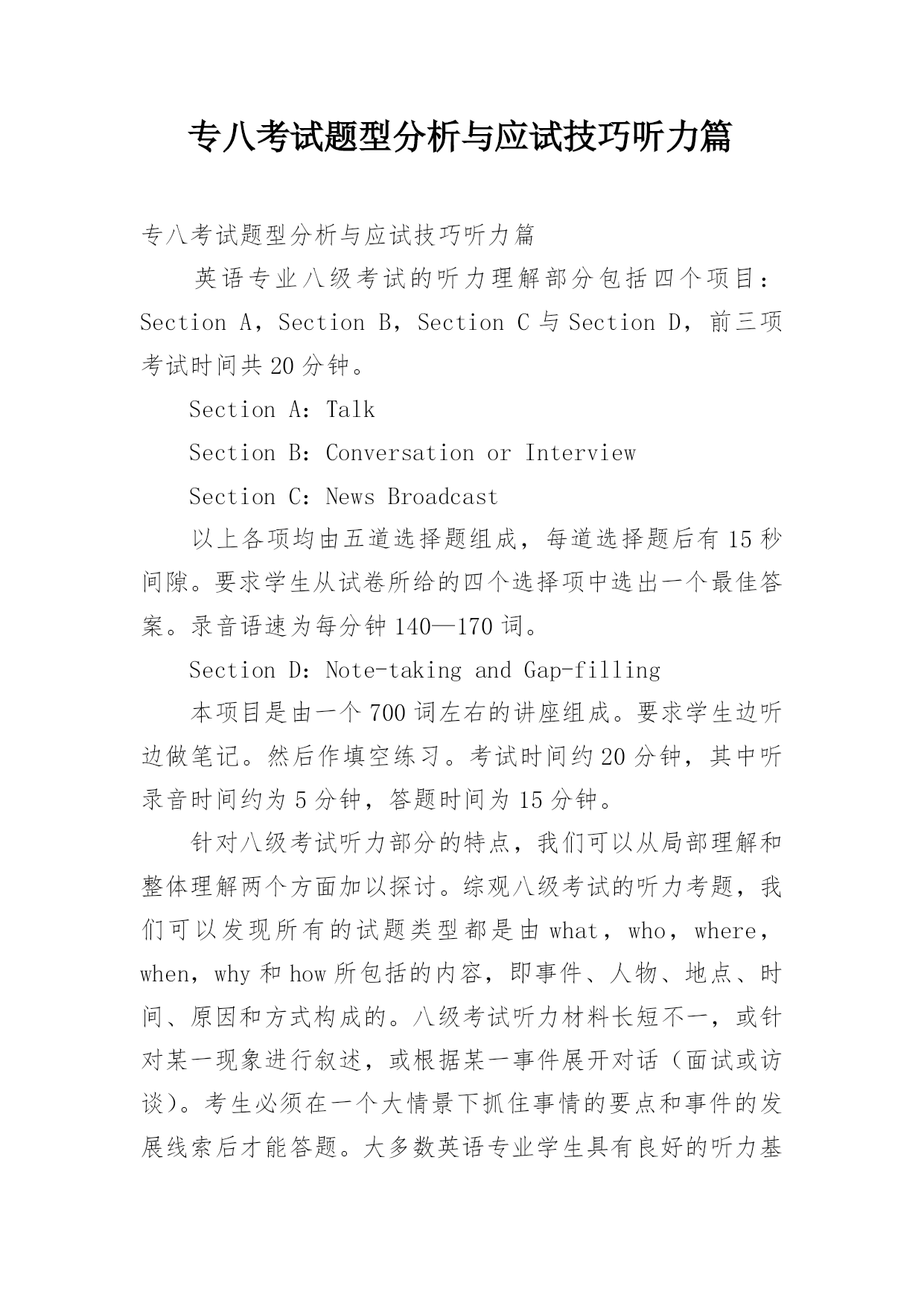 专八考试题型分析与应试技巧听力篇专八考试题型分析与应试技巧听力篇英语专业八级考试的听力理解部分包括四个项目:SectionA,SectionB,SectionC与SectionD,前三项考试时间共20分钟。SectionA:TalkSectionB:ConversationorInterviewSectionC:NewsBroadcast以上各项均由五道选择题组成,每道选择题后有15秒间隙。要求学生从试卷所给的四个选择项中选出一个最佳答案。录音语速为每分钟140—170词。SectionD:Note-ta