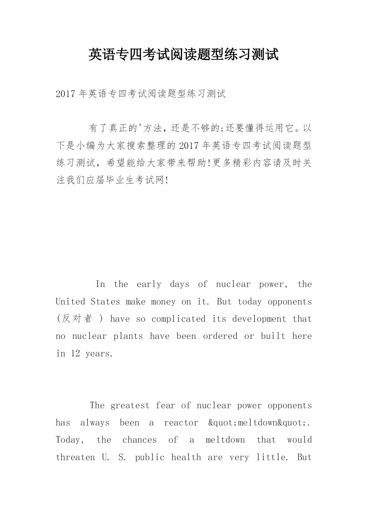 英语专四考试阅读题型练习测试2017年英语专四考试阅读题型练习测试有了真正的'方法,还是不够的;还要懂得运用它。以下是小编为大家搜索整理的2017年英语专四考试阅读题型练习测试,希望能给大家带来帮助!更多精彩内容请及时关注我们应届毕业生考试网!Intheearlydaysofnuclearpower,theUnitedStatesmakemoneyonit.Buttodayopponents(反对者)havesocomplicateditsdevelopmentthatnonuclearplantshav