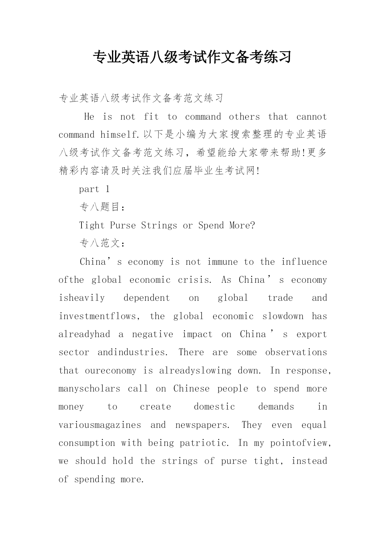 专业英语八级考试作文备考练习专业英语八级考试作文备考范文练习Heisnotfittocommandothersthatcannotcommandhimself.以下是小编为大家搜索整理的专业英语八级考试作文备考范文练习,希望能给大家带来帮助!更多精彩内容请及时关注我们应届毕业生考试网!part1专八题目:TightPurseStringsorSpendMore?专八范文:China’seconomyisnotimmunetotheinfluenceoftheglobaleconomiccrisis.AsC