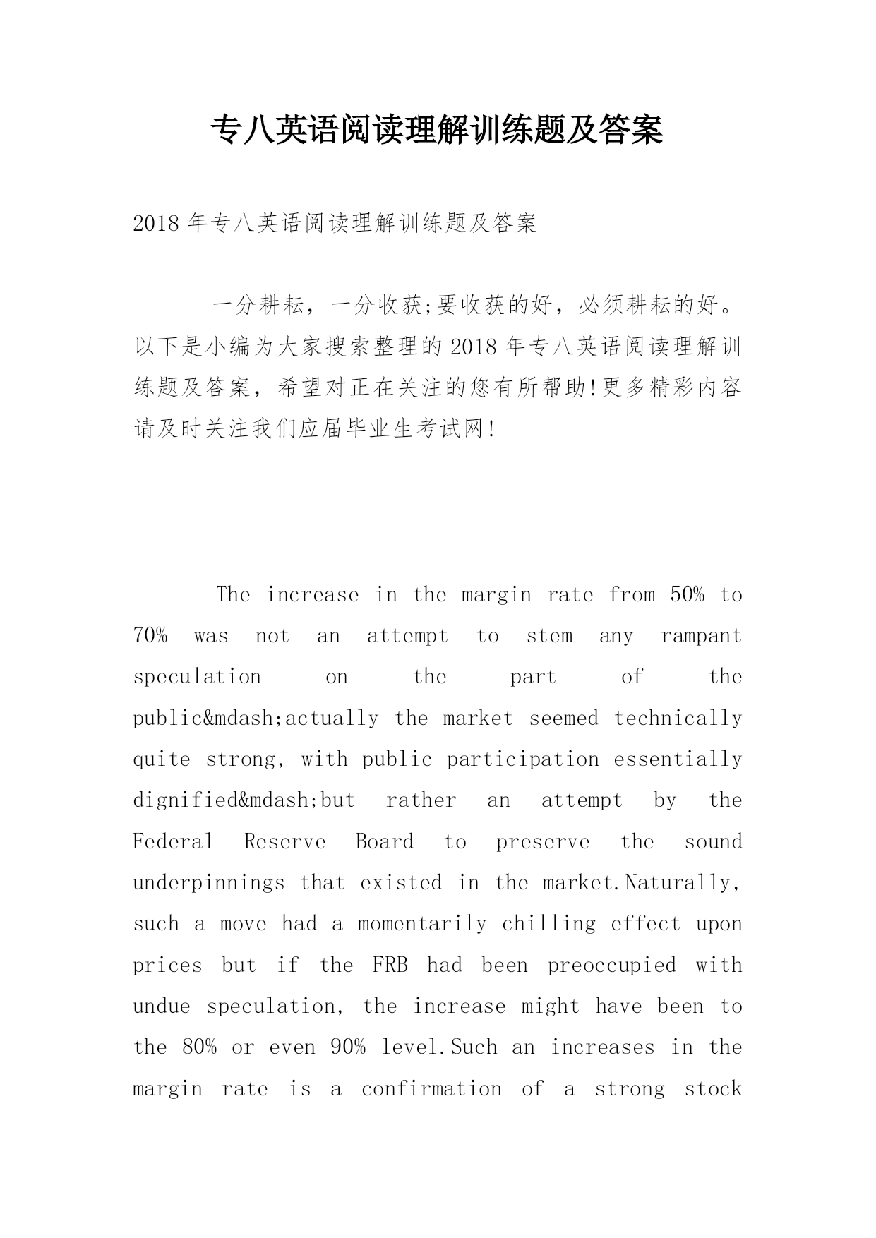 专八英语阅读理解训练题及答案2018年专八英语阅读理解训练题及答案一分耕耘,一分收获;要收获的好,必须耕耘的好。以下是小编为大家搜索整理的2018年专八英语阅读理解训练题及答案,希望对正在关注的您有所帮助!更多精彩内容请及时关注我们应届毕业生考试网!Theincreaseinthemarginratefrom50%to70%wasnotanattempttostemanyrampantspeculationonthepartofthepublic—actuallythemarketseemed