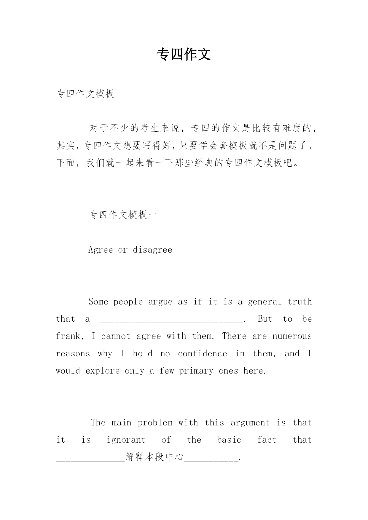 专四作文专四作文模板对于不少的考生来说,专四的作文是比较有难度的,其实,专四作文想要写得好,只要学会套模板就不是问题了。下面,我们就一起来看一下那些经典的专四作文模板吧。专四作文模板一AgreeordisagreeSomepeopleargueasifitisageneraltruththata_____________________________.Buttobefrank,Icannotagreewiththem.TherearenumerousreasonswhyIholdnoconfidence