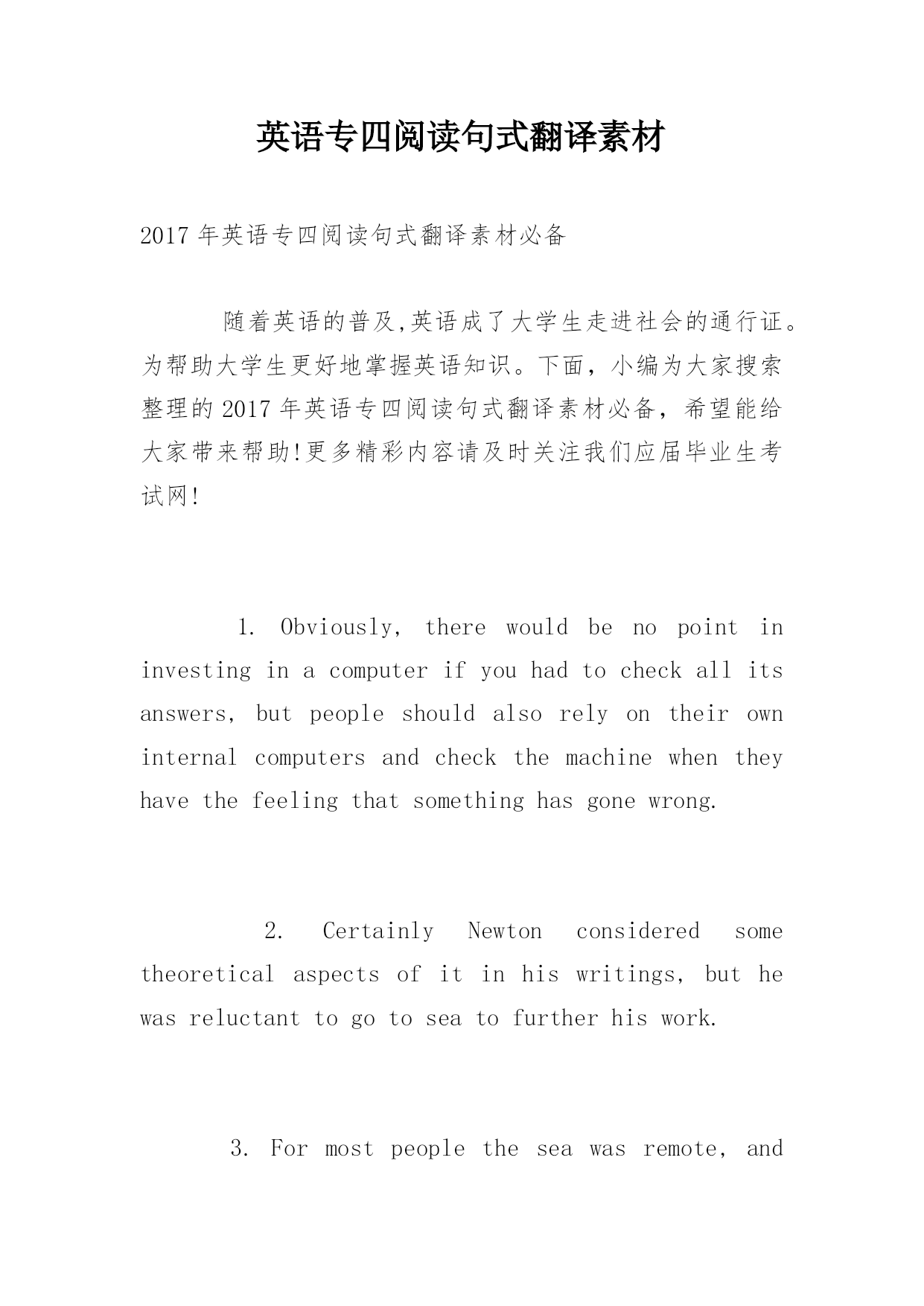 英语专四阅读句式翻译素材2017年英语专四阅读句式翻译素材必备随着英语的普及,英语成了大学生走进社会的通行证。为帮助大学生更好地掌握英语知识。下面,小编为大家搜索整理的2017年英语专四阅读句式翻译素材必备,希望能给大家带来帮助!更多精彩内容请及时关注我们应届毕业生考试网!1.Obviously,therewouldbenopointininvestinginacomputerifyouhadtocheckallitsanswers,butpeopleshouldalsorelyontheirownint