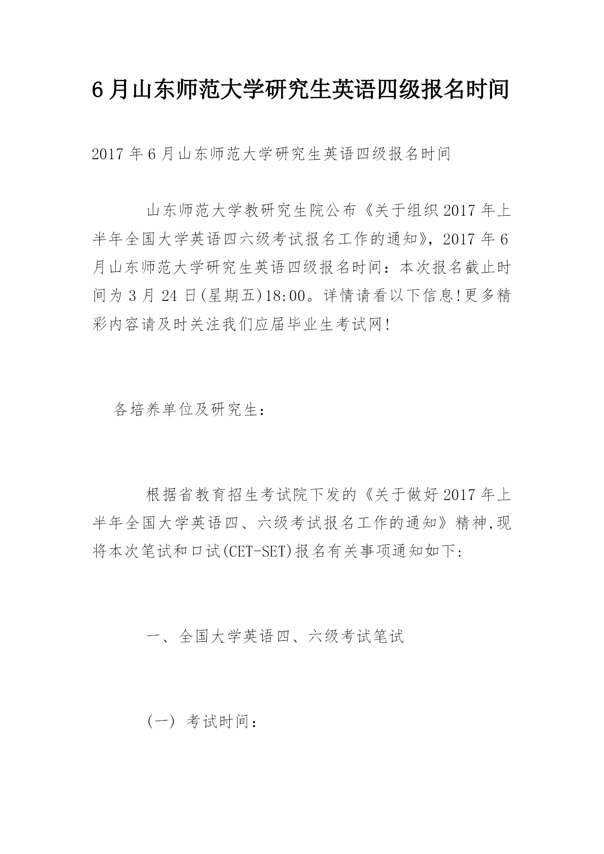 6月山东师范大学研究生英语四级报名时间2017年6月山东师范大学研究生英语四级报名时间山东师范大学教研究生院公布《关于组织2017年上半年全国大学英语四六级考试报名工作的通知》,2017年6月山东师范大学研究生英语四级报名时间:本次报名截止时间为3月24日(星期五)18:00。详情请看以下信息!更多精彩内容请及时关注我们应届毕业生考试网!各培养单位及研究生:根据省教育招生考试院下发的《关于做好2017年上半年全国大学英语四、六级考试报名工作的通知》精神,现将本次笔试和口试(CET-SET)报名有关事项通知