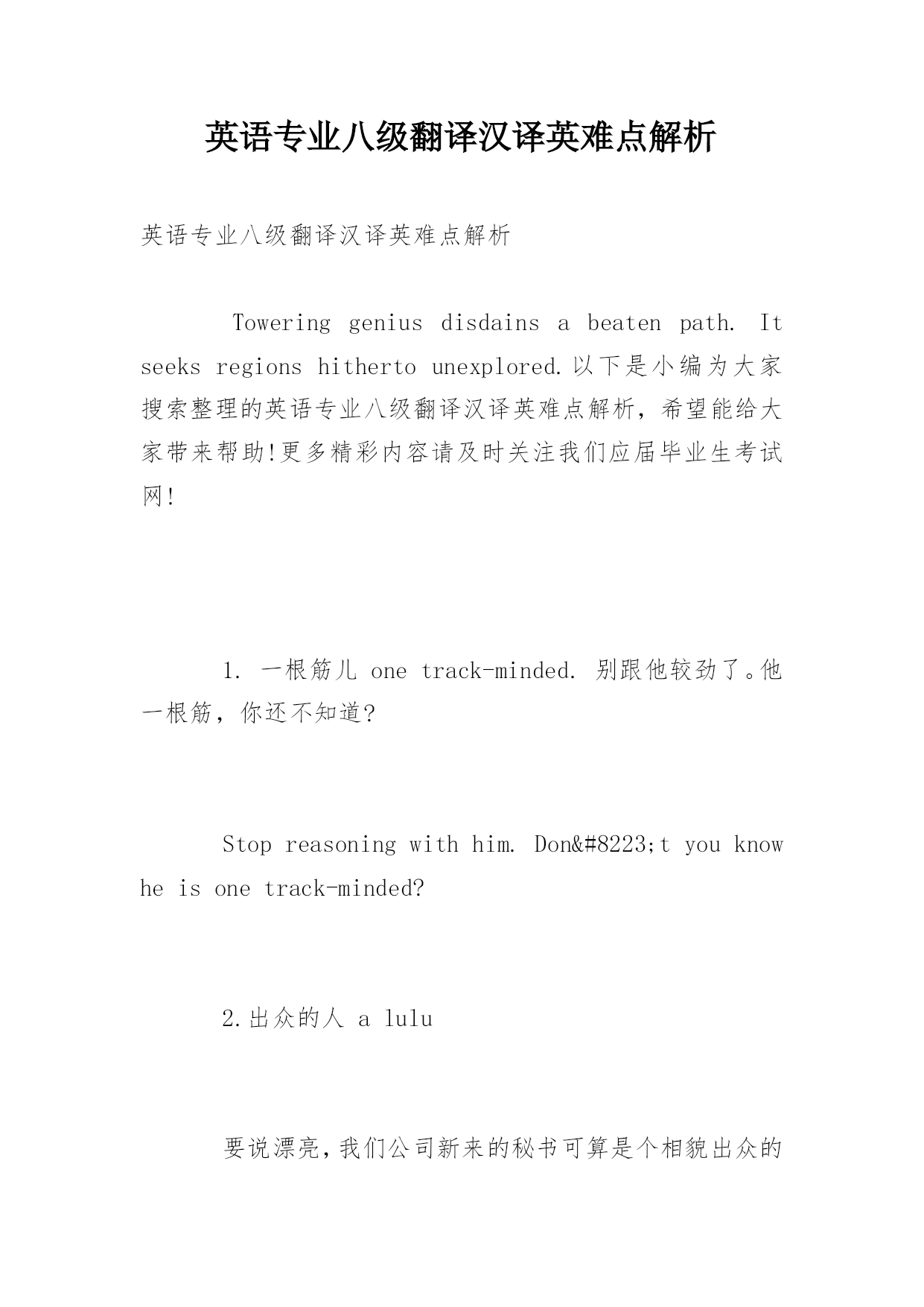 英语专业八级翻译汉译英难点解析英语专业八级翻译汉译英难点解析Toweringgeniusdisdainsabeatenpath.Itseeksregionshithertounexplored.以下是小编为大家搜索整理的英语专业八级翻译汉译英难点解析,希望能给大家带来帮助!更多精彩内容请及时关注我们应届毕业生考试网!1.一根筋儿onetrack-minded.别跟他较劲了。他一根筋,你还不知道?Stopreasoningwithhim.Don‟tyouknowheisonetrack-mind