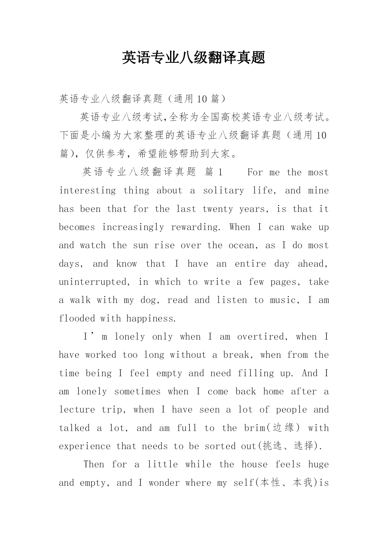 英语专业八级翻译真题英语专业八级翻译真题(通用10篇)英语专业八级考试,全称为全国高校英语专业八级考试。下面是小编为大家整理的英语专业八级翻译真题(通用10篇),仅供参考,希望能够帮助到大家。英语专业八级翻译真题篇1Formethemostinterestingthingaboutasolitarylife,andminehasbeenthatforthelasttwentyyears,isthatitbecomesincreasinglyrewarding.WhenIcanwakeupandwatcht