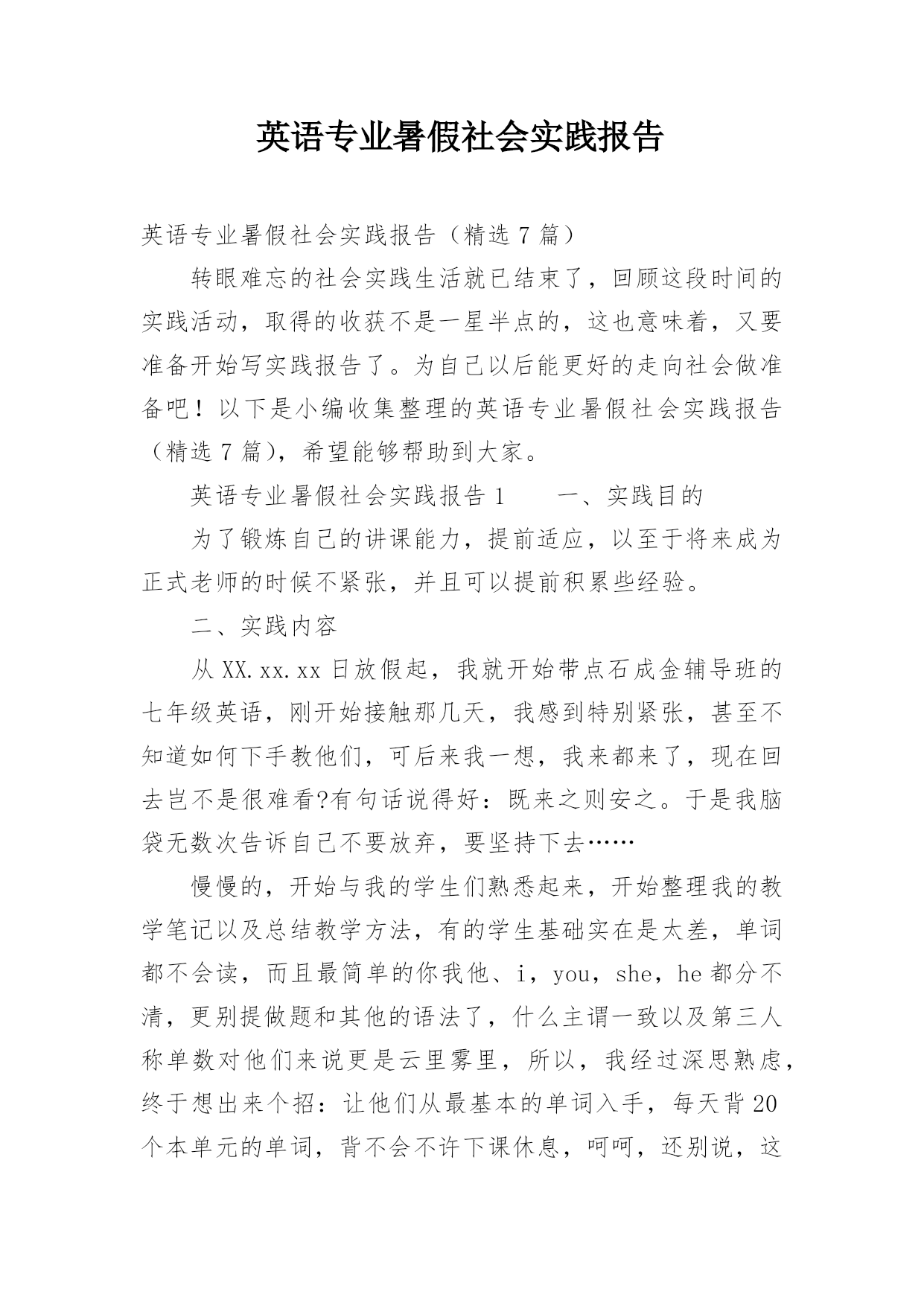 英语专业暑假社会实践报告英语专业暑假社会实践报告(精选7篇)转眼难忘的社会实践生活就已结束了,回顾这段时间的实践活动,取得的收获不是一星半点的,这也意味着,又要准备开始写实践报告了。为自己以后能更好的走向社会做准备吧!以下是小编收集整理的英语专业暑假社会实践报告(精选7篇),希望能够帮助到大家。英语专业暑假社会实践报告1一、实践目的为了锻炼自己的讲课能力,提前适应,以至于将来成为正式老师的时候不紧张,并且可以提前积累些经验。二、实践内容从XX.xx.xx日放假起,我就开始带点石成金辅导班的七年级英语,刚开