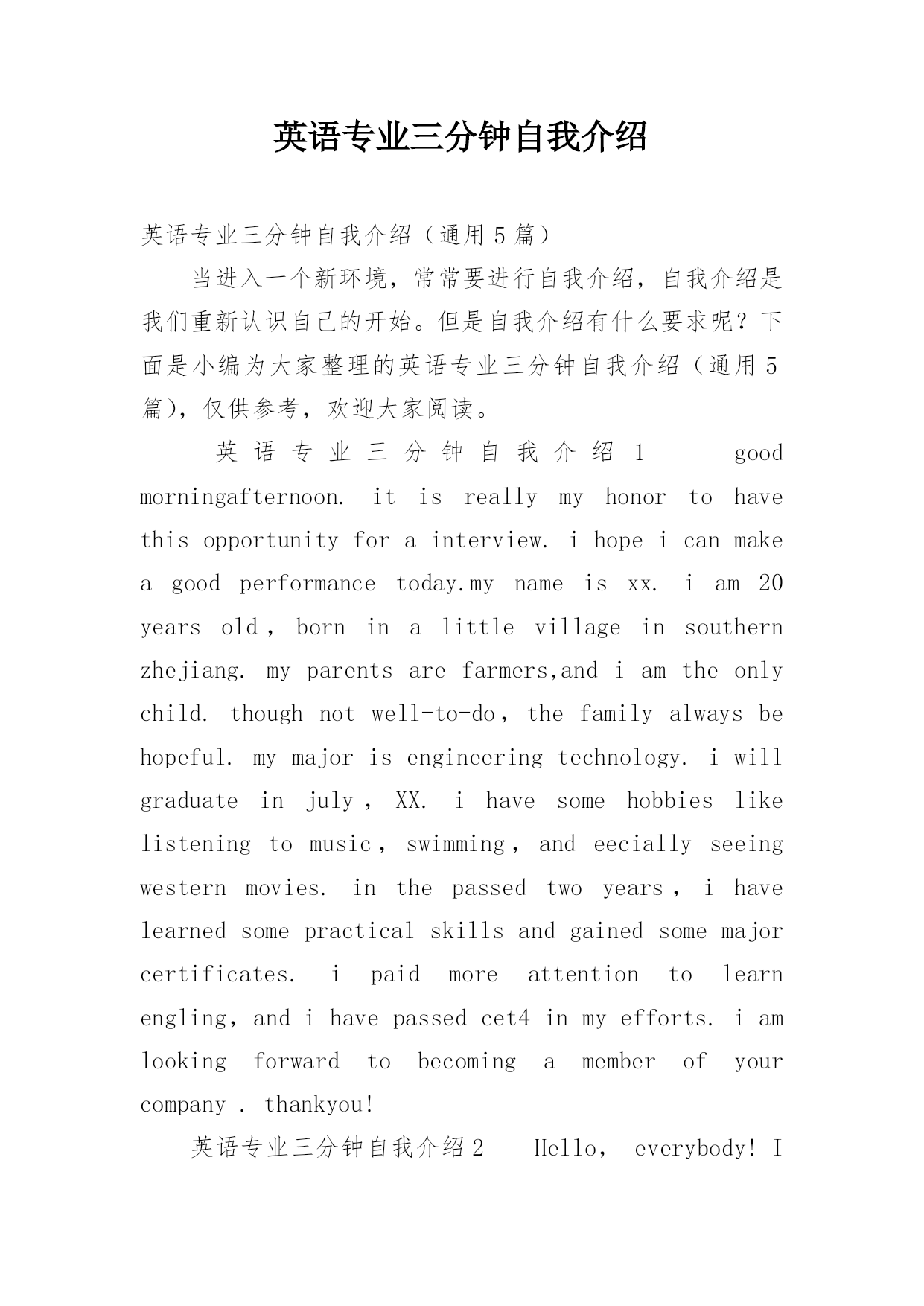 英语专业三分钟自我介绍英语专业三分钟自我介绍(通用5篇)当进入一个新环境,常常要进行自我介绍,自我介绍是我们重新认识自己的开始。但是自我介绍有什么要求呢?下面是小编为大家整理的英语专业三分钟自我介绍(通用5篇),仅供参考,欢迎大家阅读。英语专业三分钟自我介绍1goodmorningafternoon.itisreallymyhonortohavethisopportunityforainterview.ihopeicanmakeagoodperformancetoday.mynameisxx.iam20y