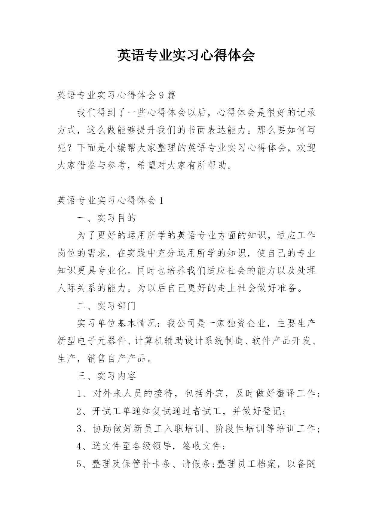英语专业实习心得体会英语专业实习心得体会9篇我们得到了一些心得体会以后,心得体会是很好的记录方式,这么做能够提升我们的书面表达能力。那么要如何写呢?下面是小编帮大家整理的英语专业实习心得体会,欢迎大家借鉴与参考,希望对大家有所帮助。英语专业实习心得体会1一、实习目的为了更好的运用所学的英语专业方面的知识,适应工作岗位的需求,在实践中充分运用所学的知识,使自己的专业知识更具专业化。同时也培养我们适应社会的能力以及处理人际关系的能力。为以后自己更好的走上社会做好准备。二、实习部门实习单位基本情况:我公司是一家