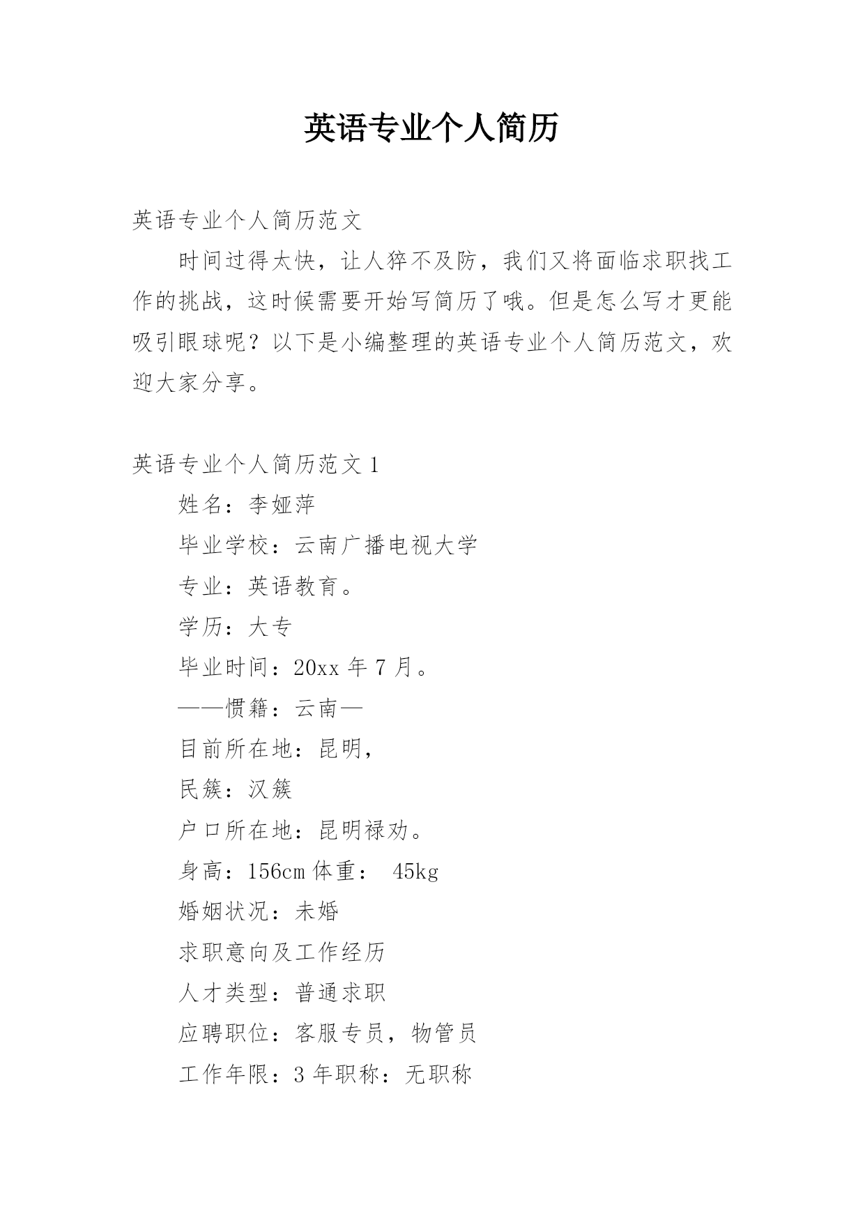英语专业个人简历英语专业个人简历范文时间过得太快,让人猝不及防,我们又将面临求职找工作的挑战,这时候需要开始写简历了哦。但是怎么写才更能吸引眼球呢?以下是小编整理的英语专业个人简历范文,欢迎大家分享。英语专业个人简历范文1姓名:李娅萍毕业学校:云南广播电视大学专业:英语教育。学历:大专毕业时间:20xx年7月。——惯籍:云南—目前所在地:昆明,民簇:汉簇户口所在地:昆明禄劝。身高:156cm体重:45kg婚姻状况:未婚求职意向及工作经历人才类型:普通求职应聘职位:客服专员,物管员工作年限:3年职称:无职称
