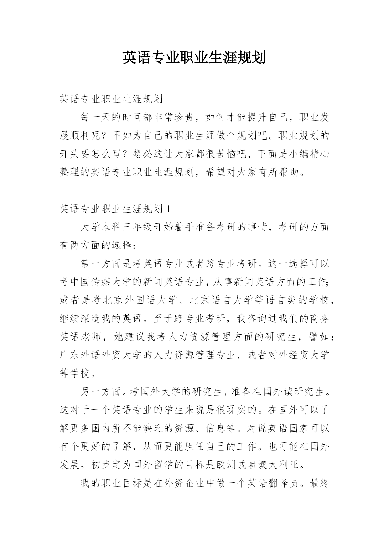 英语专业职业生涯规划英语专业职业生涯规划每一天的时间都非常珍贵,如何才能提升自己,职业发展顺利呢?不如为自己的职业生涯做个规划吧。职业规划的开头要怎么写?想必这让大家都很苦恼吧,下面是小编精心整理的英语专业职业生涯规划,希望对大家有所帮助。英语专业职业生涯规划1大学本科三年级开始着手准备考研的事情,考研的方面有两方面的选择:第一方面是考英语专业或者跨专业考研。这一选择可以考中国传媒大学的新闻英语专业,从事新闻英语方面的工作;或者是考北京外国语大学、北京语言大学等语言类的学校,继续深造我的英语。至于跨专业考