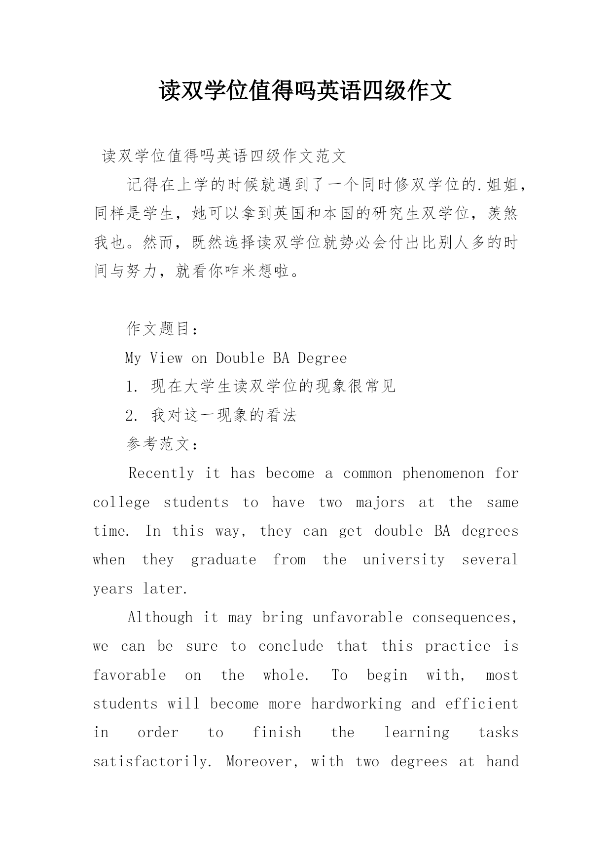 读双学位值得吗英语四级作文读双学位值得吗英语四级作文范文记得在上学的时候就遇到了一个同时修双学位的.姐姐,同样是学生,她可以拿到英国和本国的研究生双学位,羡煞我也。然而,既然选择读双学位就势必会付出比别人多的时间与努力,就看你咋米想啦。作文题目:MyViewonDoubleBADegree1.现在大学生读双学位的现象很常见2.我对这一现象的看法参考范文:Recentlyithasbecomeacommonphenomenonforcollegestudentstohavetwomajorsatthesam
