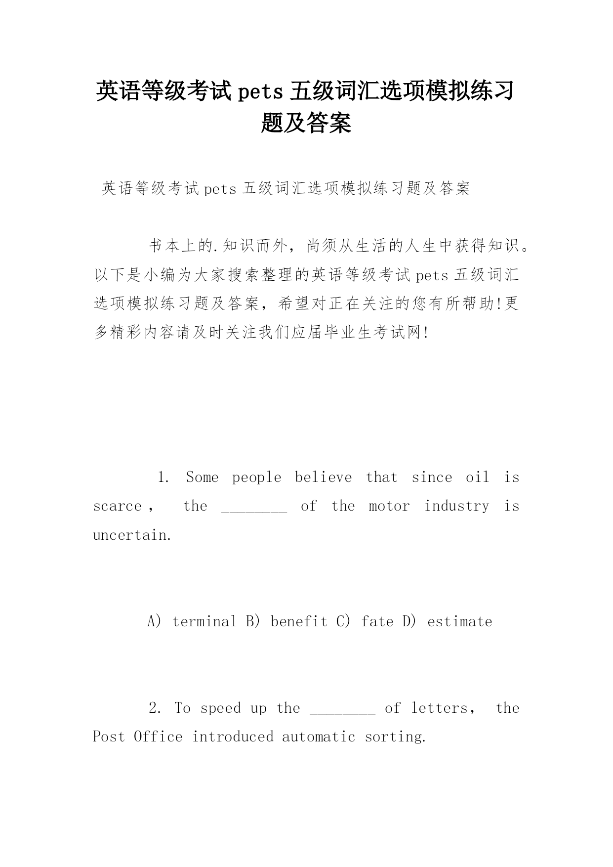 英语等级考试pets五级词汇选项模拟练习题及答案英语等级考试pets五级词汇选项模拟练习题及答案书本上的.知识而外,尚须从生活的人生中获得知识。以下是小编为大家搜索整理的英语等级考试pets五级词汇选项模拟练习题及答案,希望对正在关注的您有所帮助!更多精彩内容请及时关注我们应届毕业生考试网!1.Somepeoplebelievethatsinceoilisscarce,the________ofthemotorindustryisuncertain.A)terminalB)benefitC)fateD)e