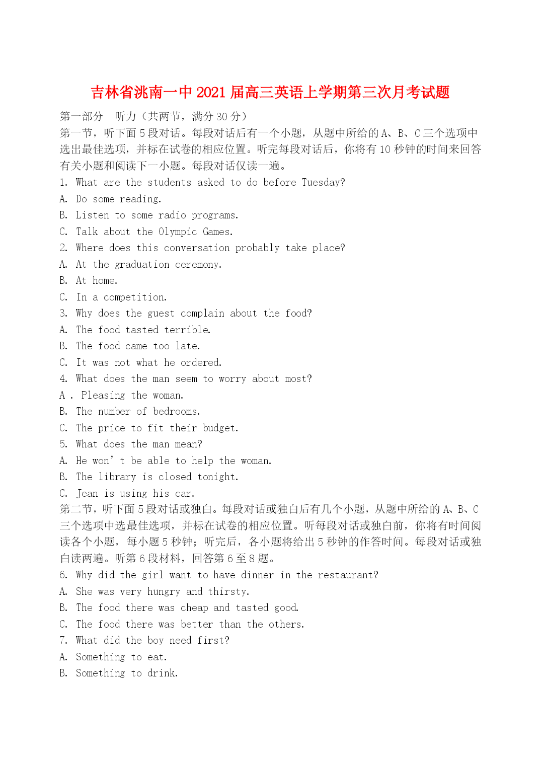 吉林省洮南一中2021届高三英语上学期第三次月考试题第一部分听力(共两节,满分30分)第一节,听下面5段对话。每段对话后有一个小题,从题中所给的A、B、C三个选项中选出最佳选项,并标在试卷的相应位置。听完每段对话后,你将有10秒钟的时间来回答有关小题和阅读下一小题。每段对话仅读一遍。1.WhatarethestudentsaskedtodobeforeTuesday?A.Dosomereading.B.Listentosomeradioprograms.C.TalkabouttheOlympicGames