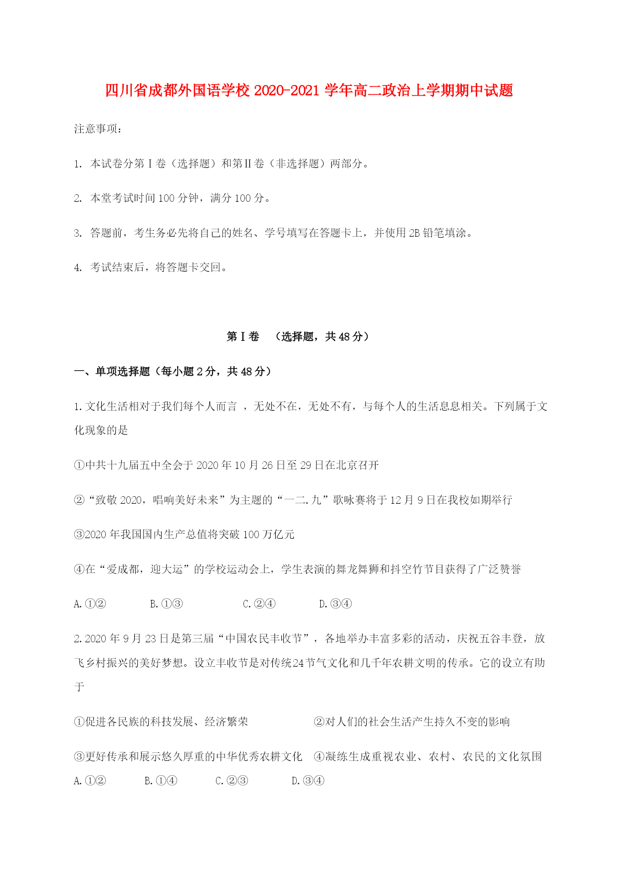 四川省成都外国语学校2020-2021学年高二政治上学期期中试题注意事项:本试卷分第Ⅰ卷(选择题)和第Ⅱ卷(非选择题)两部分。本堂考试时间100分钟,满分100分。答题前,考生务必先将自己的姓名、学号填写在答题卡上,并使用2B铅笔填涂。考试结束后,将答题卡交回。第Ⅰ卷(选择题,共48分)一、单项选择题(每小题2分,共48分)1.文化生活相对于我们每个人而言,无处不在,无处不有,与每个人的生活息息相关。下列属于文化现象的是①中共十九届五中全会于2020年10月26日至29日在北京召开②“致敬2020,唱响美