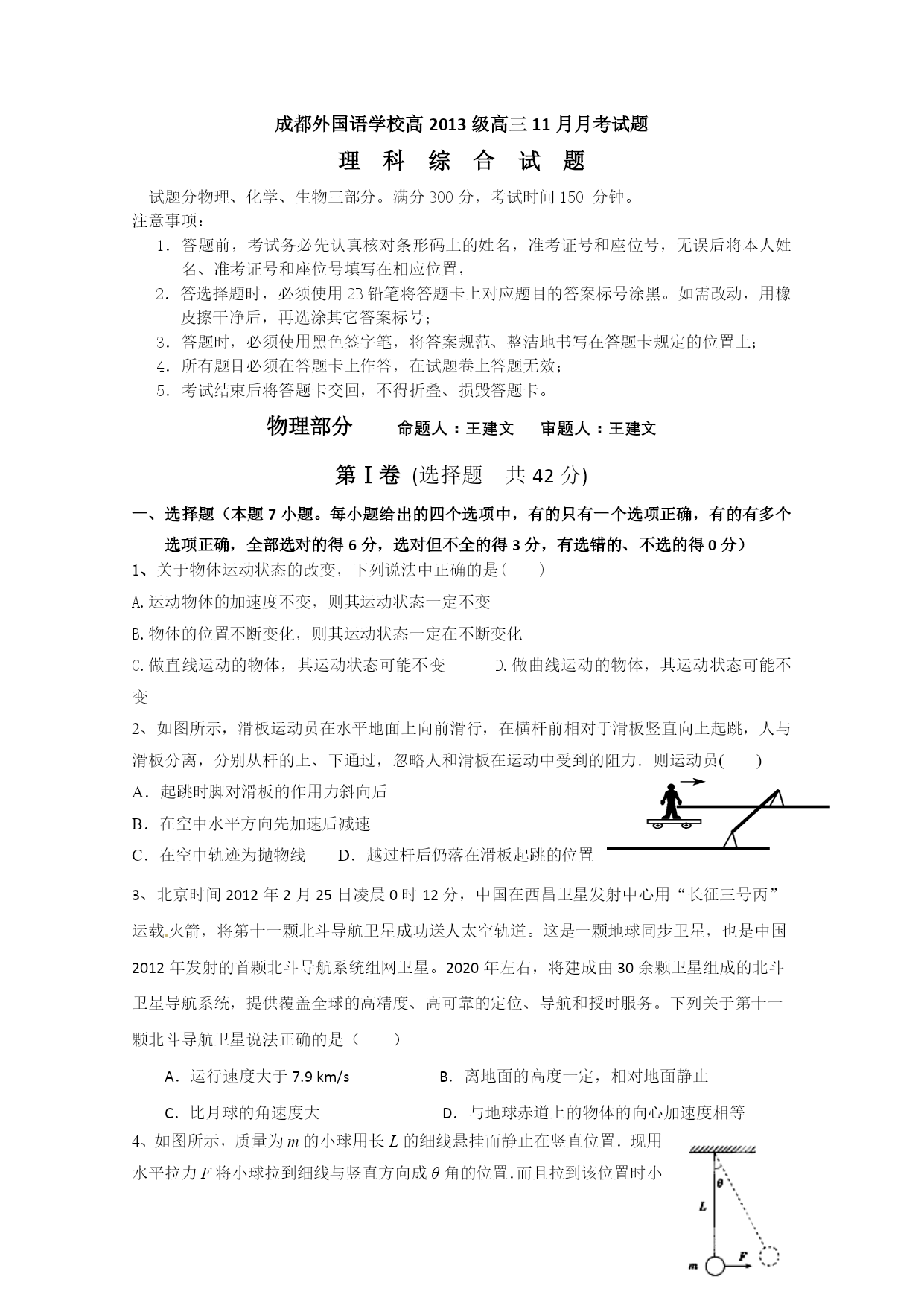 成都外国语学校高2013级高三11月月考试题理科综合试题试题分物理、化学、生物三部分。满分300分,考试时间150分钟。注意事项:1.答题前,考试务必先认真核对条形码上的姓名,准考证号和座位号,无误后将本人姓名、准考证号和座位号填写在相应位置,2.答选择题时,必须使用2B铅笔将答题卡上对应题目的答案标号涂黑。如需改动,用橡皮擦干净后,再选涂其它答案标号;3.答题时,必须使用黑色签字笔,将答案规范、整洁地书写在答题卡规定的位置上;4.所有题目必须在答题卡上作答,在试题卷上答题无效;5.考试结束后将答题卡交回