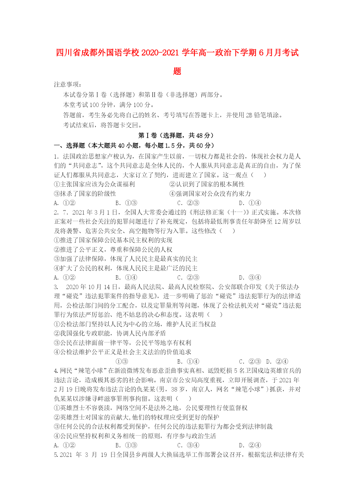 四川省成都外国语学校2020-2021学年高一政治下学期6月月考试题注意事项:本试卷分第Ⅰ卷(选择题)和第Ⅱ卷(非选择题)两部分。本堂考试100分钟,满分100分。答题前,考生务必先将自己的姓名、考号填写在答题卡上,并使用2B铅笔填涂。考试结束后,将答题卡交回。第Ⅰ卷(选择题,共48分)一、选择题(本大题共40小题,每小题1.5分,共60分)1.法国政治思想家卢梭认为,在国家产生以前,一切权力都是社会的,体现社会权力是人们的“共同意志”,这个共同意志是全体人民的,个人服从共同意志是真正的自由,为了保证人们