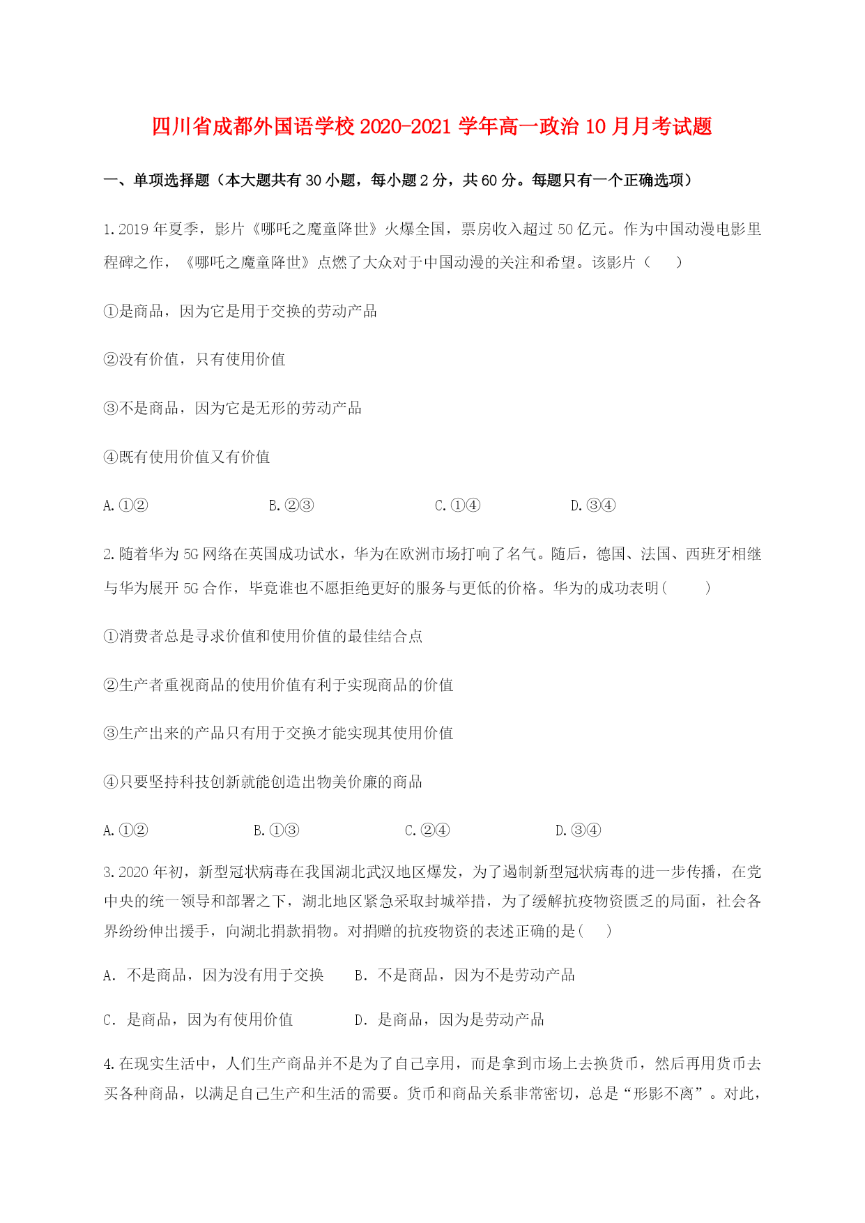 四川省成都外国语学校2020-2021学年高一政治10月月考试题一、单项选择题(本大题共有30小题,每小题2分,共60分。每题只有一个正确选项)1.2019年夏季,影片《哪吒之魔童降世》火爆全国,票房收入超过50亿元。作为中国动漫电影里程碑之作,《哪吒之魔童降世》点燃了大众对于中国动漫的关注和希望。该影片()①是商品,因为它是用于交换的劳动产品②没有价值,只有使用价值③不是商品,因为它是无形的劳动产品④既有使用价值又有价值A.①②B.②③C.①④D.③④2.随着华为5G网络在英国成功试水,华为在欧洲市场打