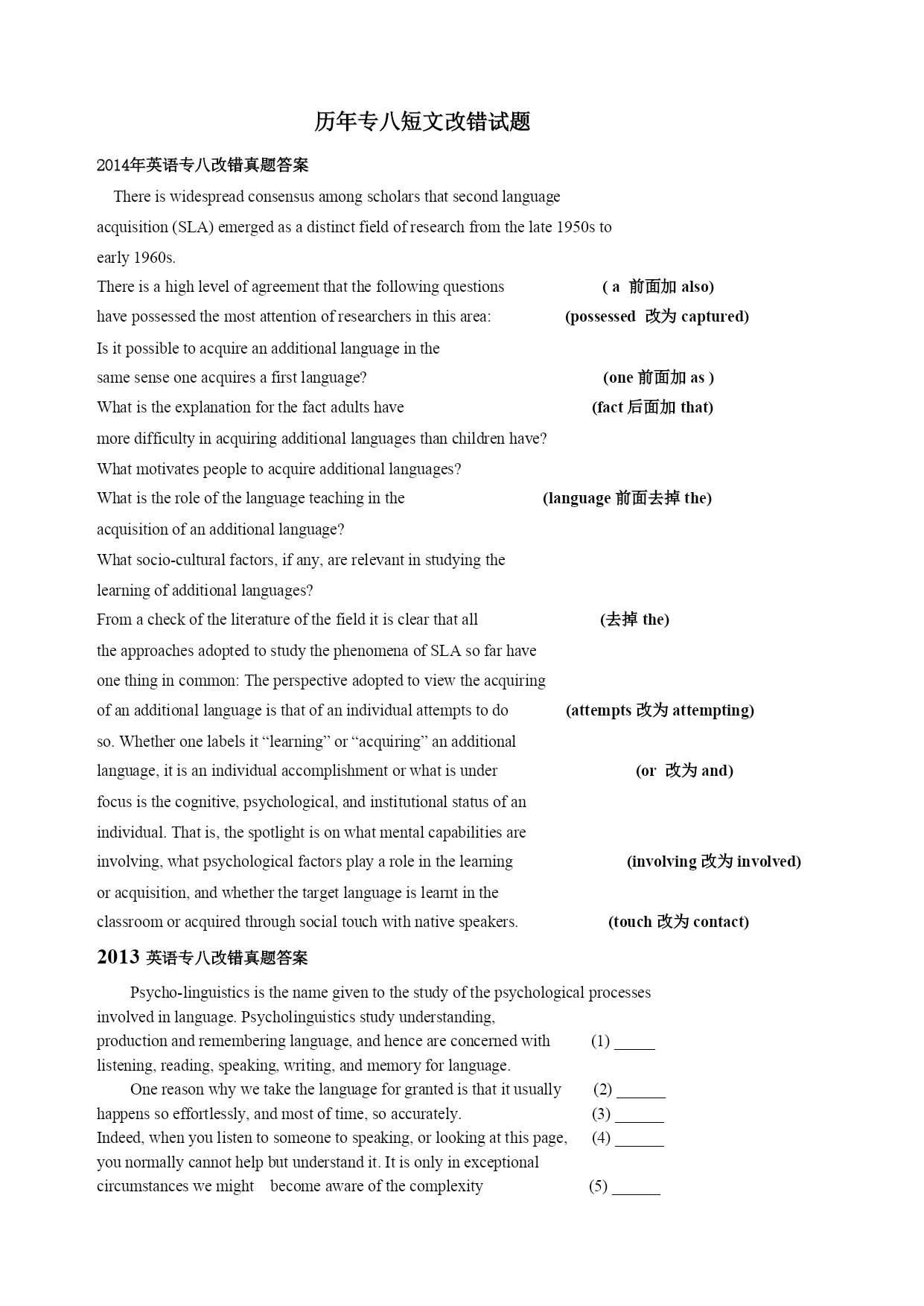 历年专八短文改错试题2014年英语专八改错真题答案Thereiswidespreadconsensusamongscholarsthatsecondlanguageacquisition(SLA)emergedasadistinctfieldofresearchfromthelate1950stoearly1960s.Thereisahighlevelofagreementthatthefollowingquestions(a前面加also)havepossessedthemostattentionofr