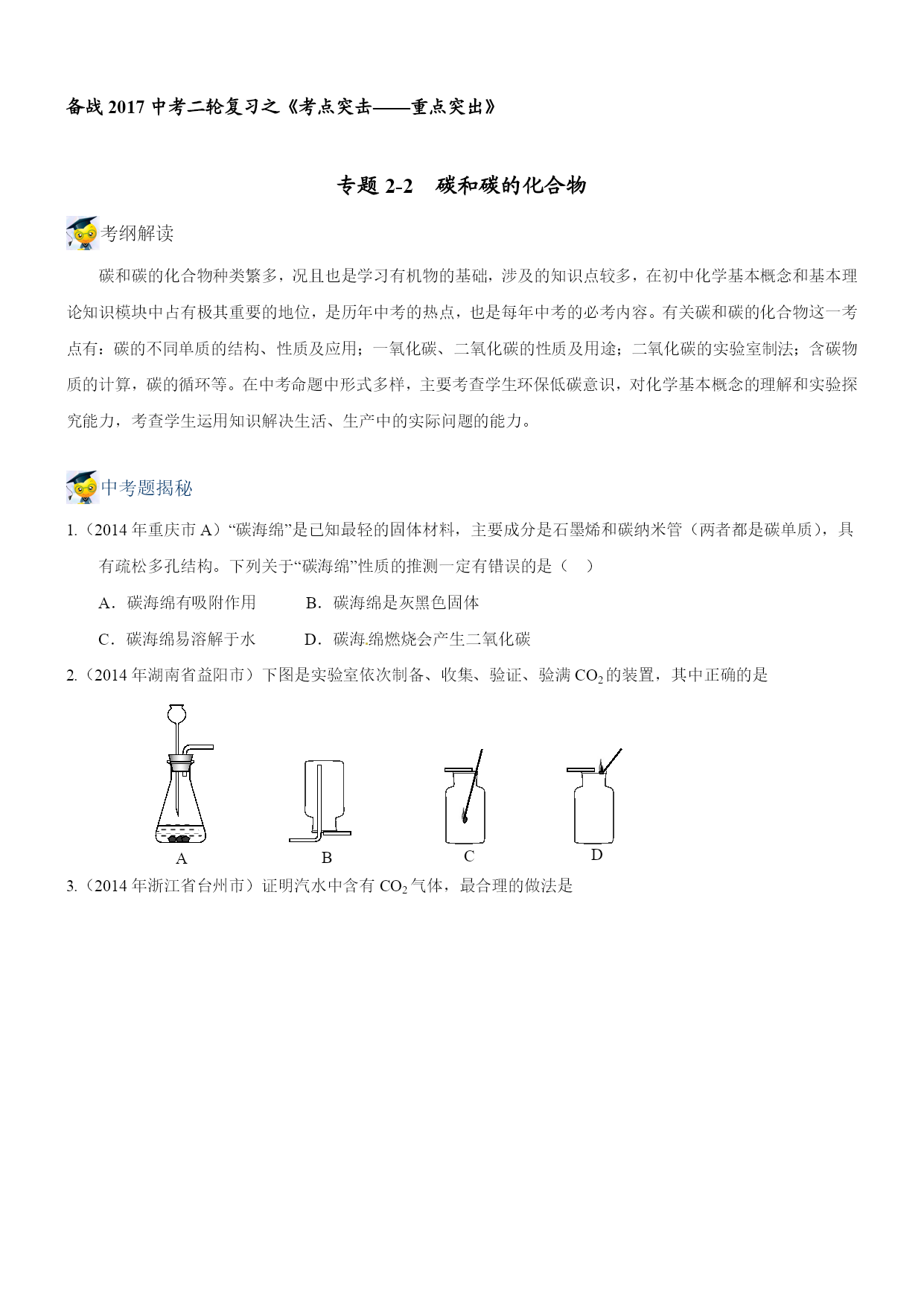 备战2017中考二轮复习之《考点突击——重点突出》专题2-2碳和碳的化合物考纲解读碳和碳的化合物种类繁多,况且也是学习有机物的基础,涉及的知识点较多,在初中化学基本概念和基本理论知识模块中占有极其重要的地位,是历年中考的热点,也是每年中考的必考内容。有关碳和碳的化合物这一考点有:碳的不同单质的结构、性质及应用;一氧化碳、二氧化碳的性质及用途;二氧化碳的实验室制法;含碳物质的计算,碳的循环等。在中考命题中形式多样,主要考查学生环保低碳意识,对化学基本概念的理解和实验探究能力,考查学生运用知识解决生活、生产中