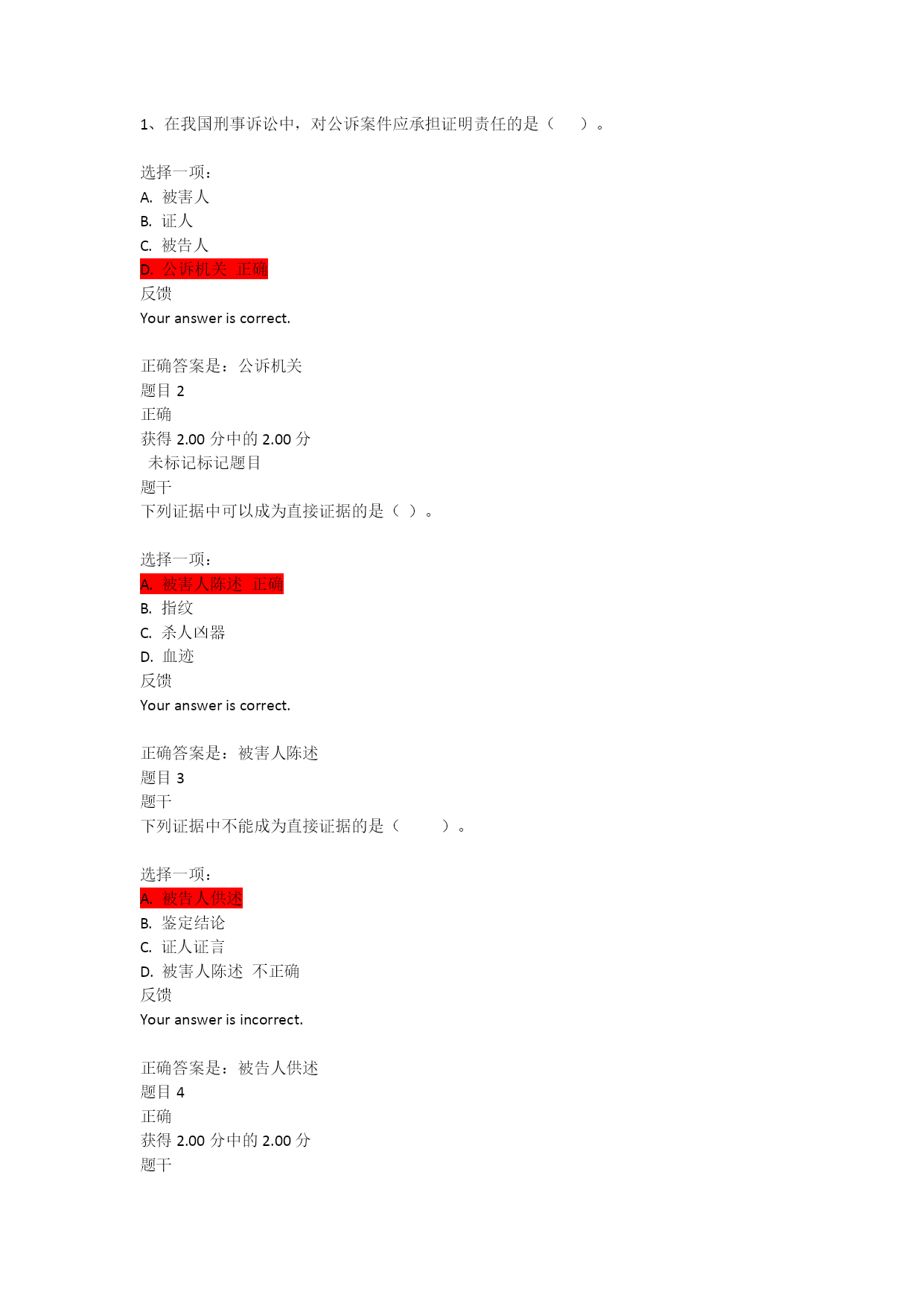 1、在我国刑事诉讼中,对公诉案件应承担证明责任的是()。选择一项:A.被害人B.证人C.被告人D.公诉机关正确反馈Youransweriscorrect.正确答案是:公诉机关题目2正确获得2.00分中的2.00分未标记标记题目题干下列证据中可以成为直接证据的是()。选择一项:A.被害人陈述正确B.指纹C.杀人凶器D.血迹反馈Youransweriscorrect.正确答案是:被害人陈述题目3题干下列证据中不能成为直接证据的是()。选择一项:A.被告人供述B.鉴定结论C.证人证言D.被害人陈述不正确反馈Yo