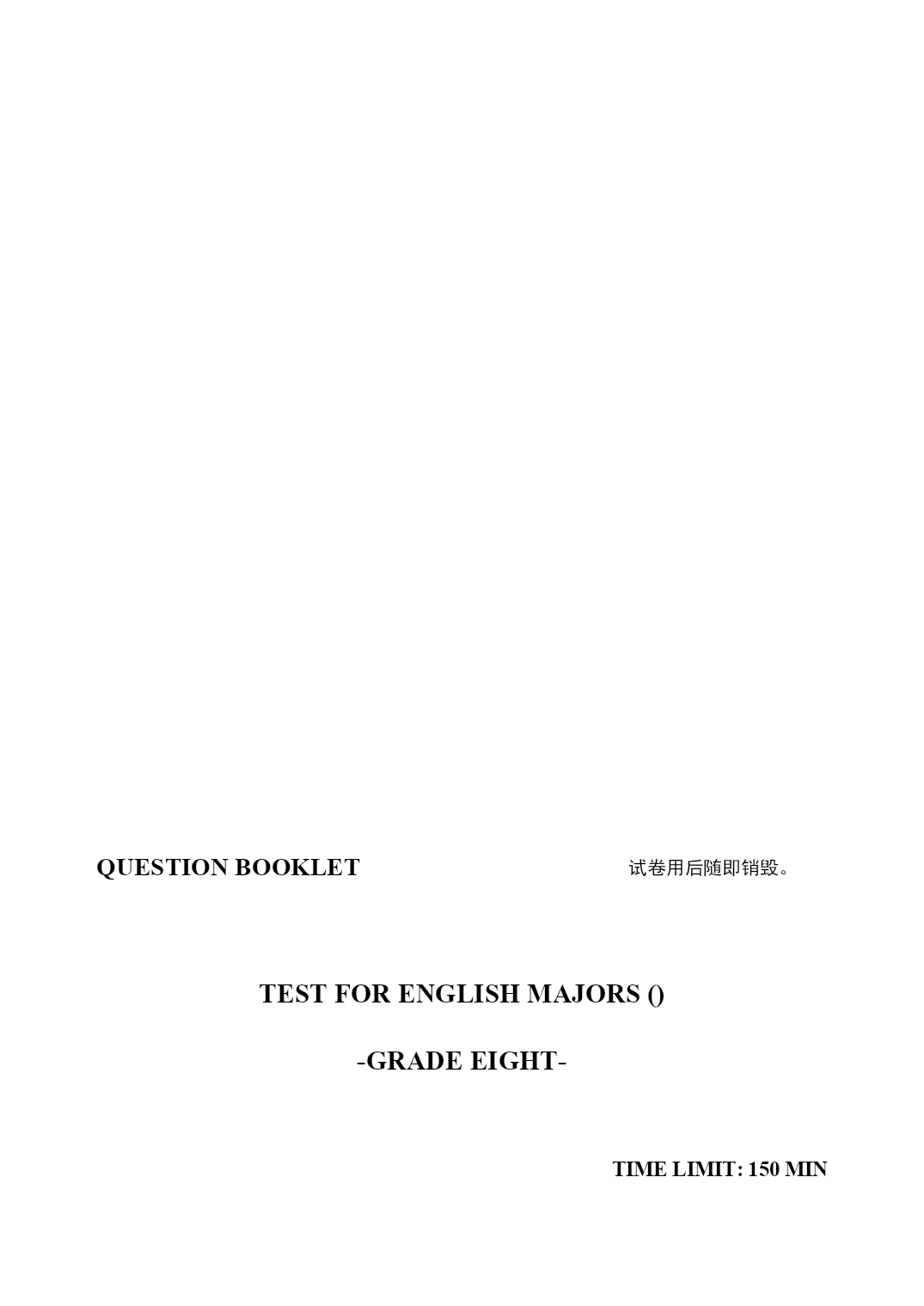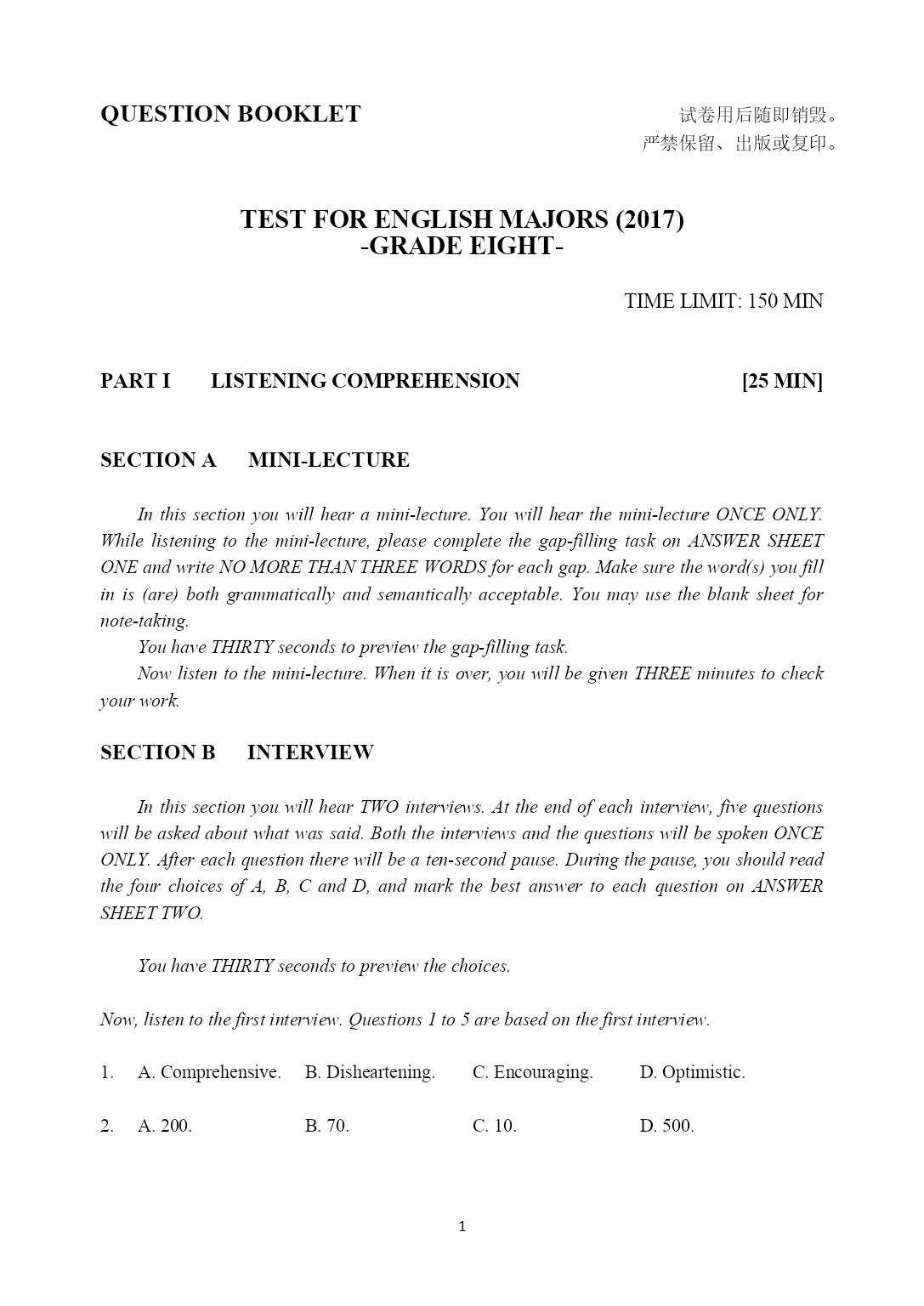 试卷用后随即销毁。严禁保留、出版或复印。QUESTIONBOOKLETTESTFORENGLISHMAJORS(2017)-GRADEEIGHT-TIMELIMIT:150MINPARTILISTENINGCOMPREHENSION[25MIN]SECTIONAMINI-LECTUREInthissectionyouwillhearamini-lecture.Youwillhearthemini-lectureONCEONLY.Whilelisteningtothemini-lecture,pleasec