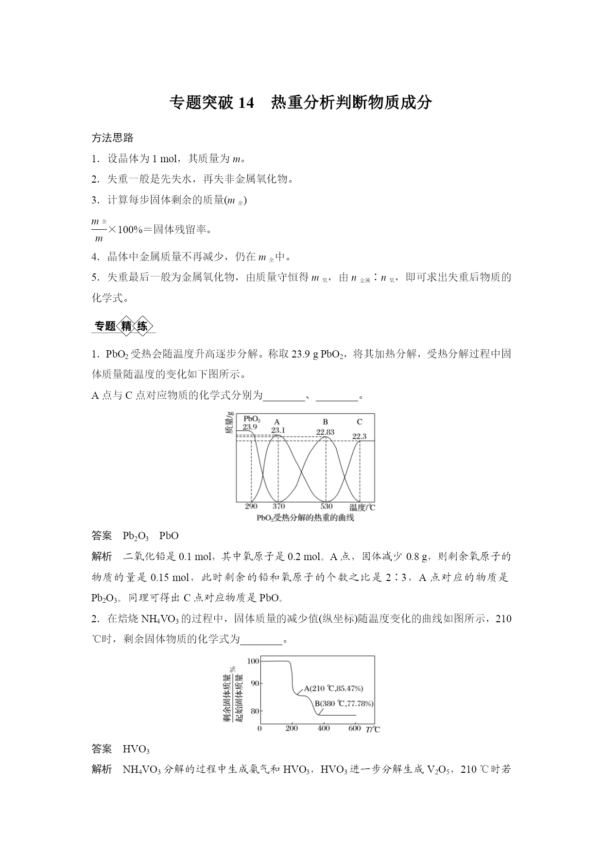 专题突破14热重分析判断物质成分方法思路1.设晶体为1mol,其质量为m。2.失重一般是先失水,再失非金属氧化物。3.计算每步固体剩余的质量(m余)eq\f(m余,m)×100%=固体残留率。4.晶体中金属质量不再减少,仍在m余中。5.失重最后一般为金属氧化物,由质量守恒得m氧,由n金属∶n氧,即可求出失重后物质的化学式。1.PbO2受热会随温度升高逐步分解。称取23.9gPbO2,将其加热分解,受热分解过程中固体质量随温度的变化如下图所示。A点与C点对应物质的化学式分别为________、____