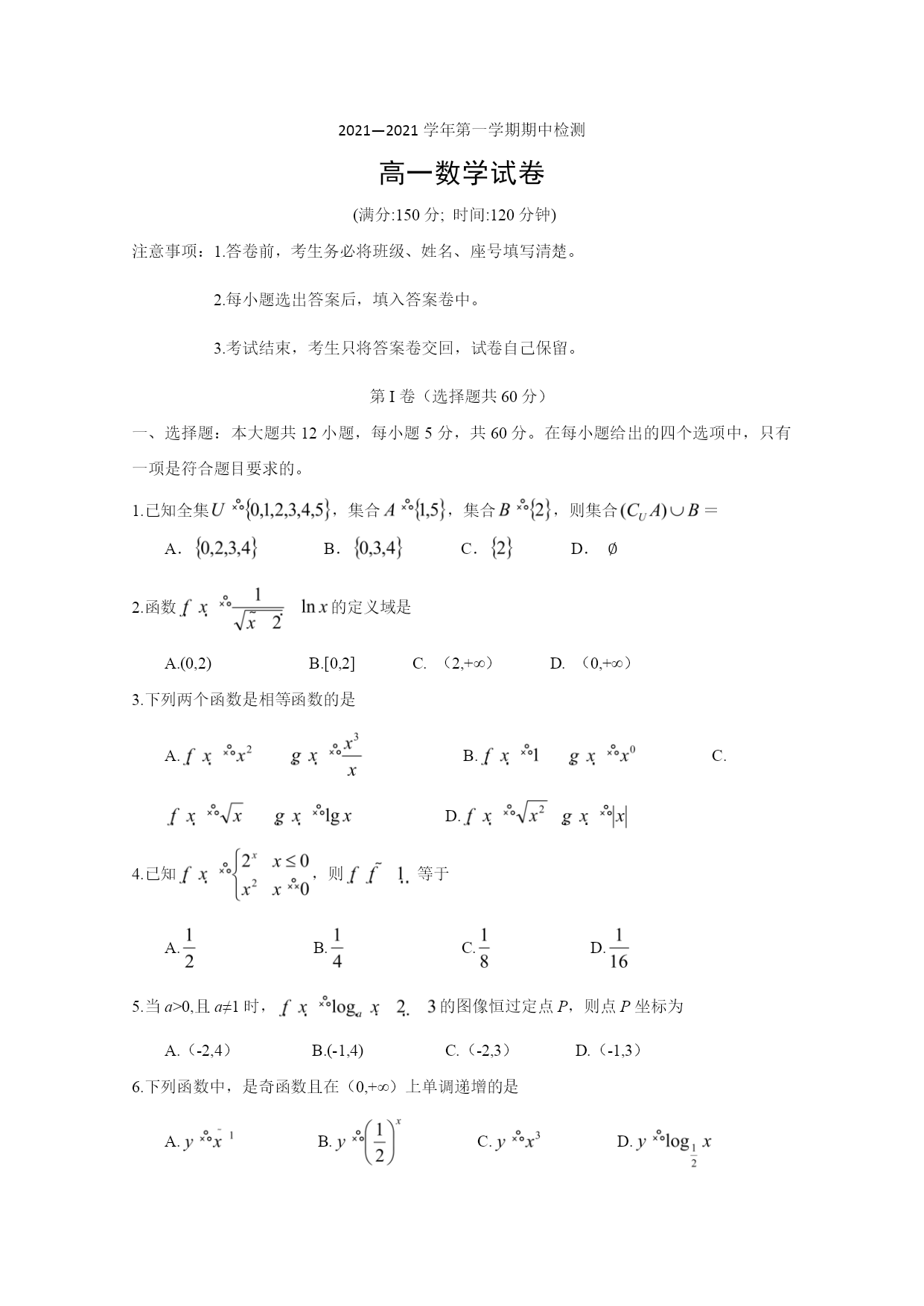 2021—2021学年第一学期期中检测高一数学试卷(满分:150分;时间:120分钟)注意事项:1.答卷前,考生务必将班级、姓名、座号填写清楚。2.每小题选出答案后,填入答案卷中。3.考试结束,考生只将答案卷交回,试卷自己保留。第I卷(选择题共60分)选择题:本大题共12小题,每小题5分,共60分。在每小题给出的四个选项中,只有一项是符合题目要求的。1.已知全集,集合,集合,则集合=A.B.C.D.∅2.函数的定义域是A.(0,2)B.[0,2]C.(2,+∞)D.(0,+∞)3.下列两个函数是相等函数的