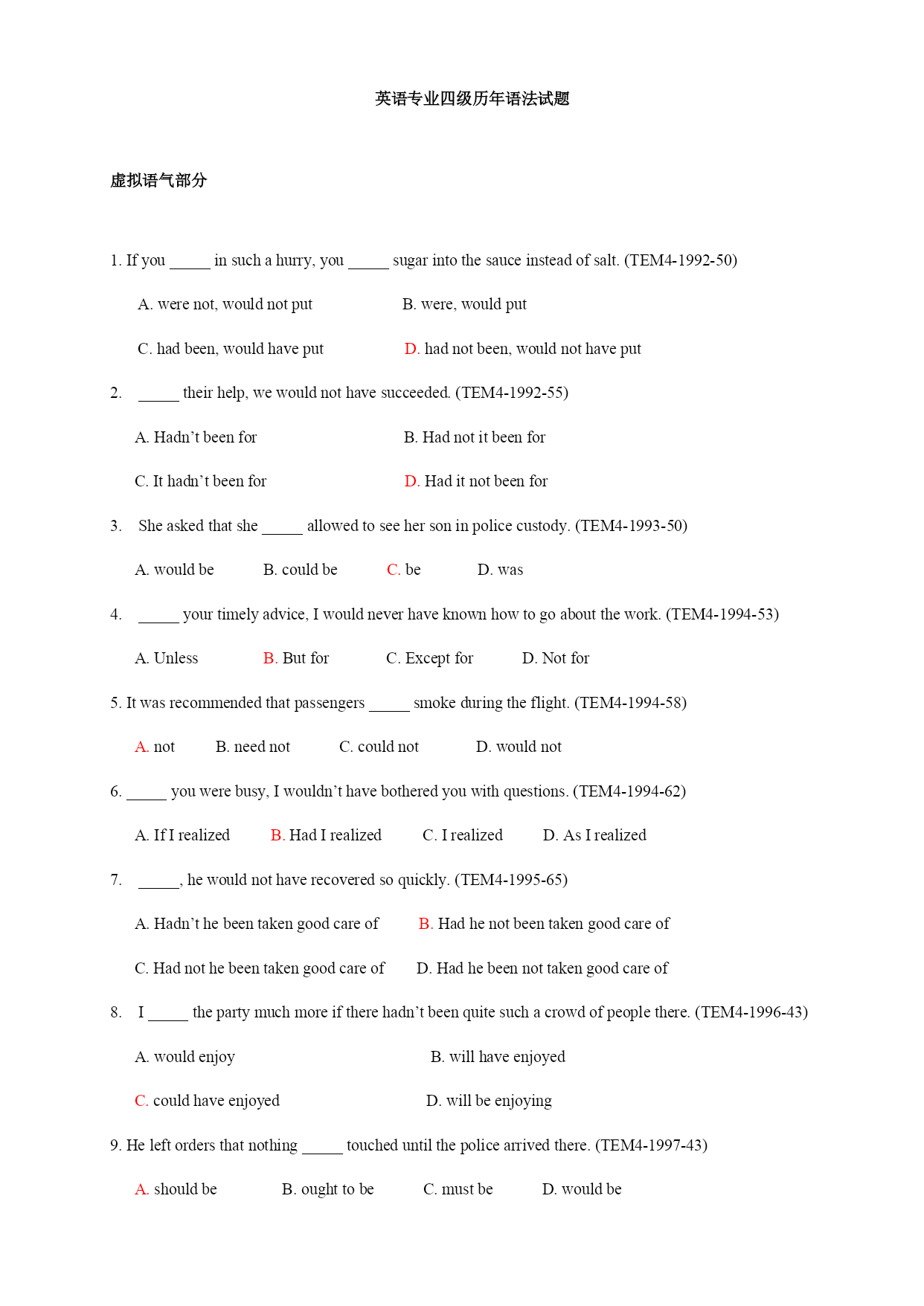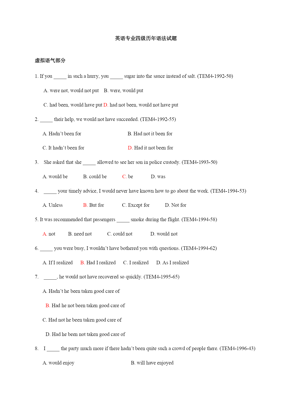 英语专业四级历年语法试题虚拟语气部分1.Ifyou_____insuchahurry,you_____sugarintothesauceinsteadofsalt.(TEM4-1992-50)A.werenot,wouldnotputB.were,wouldputC.hadbeen,wouldhaveputD.hadnotbeen,wouldnothaveput2._____theirhelp,wewouldnothavesucceeded.(TEM4-1992-55)A.Hadn’tbeenforB.H