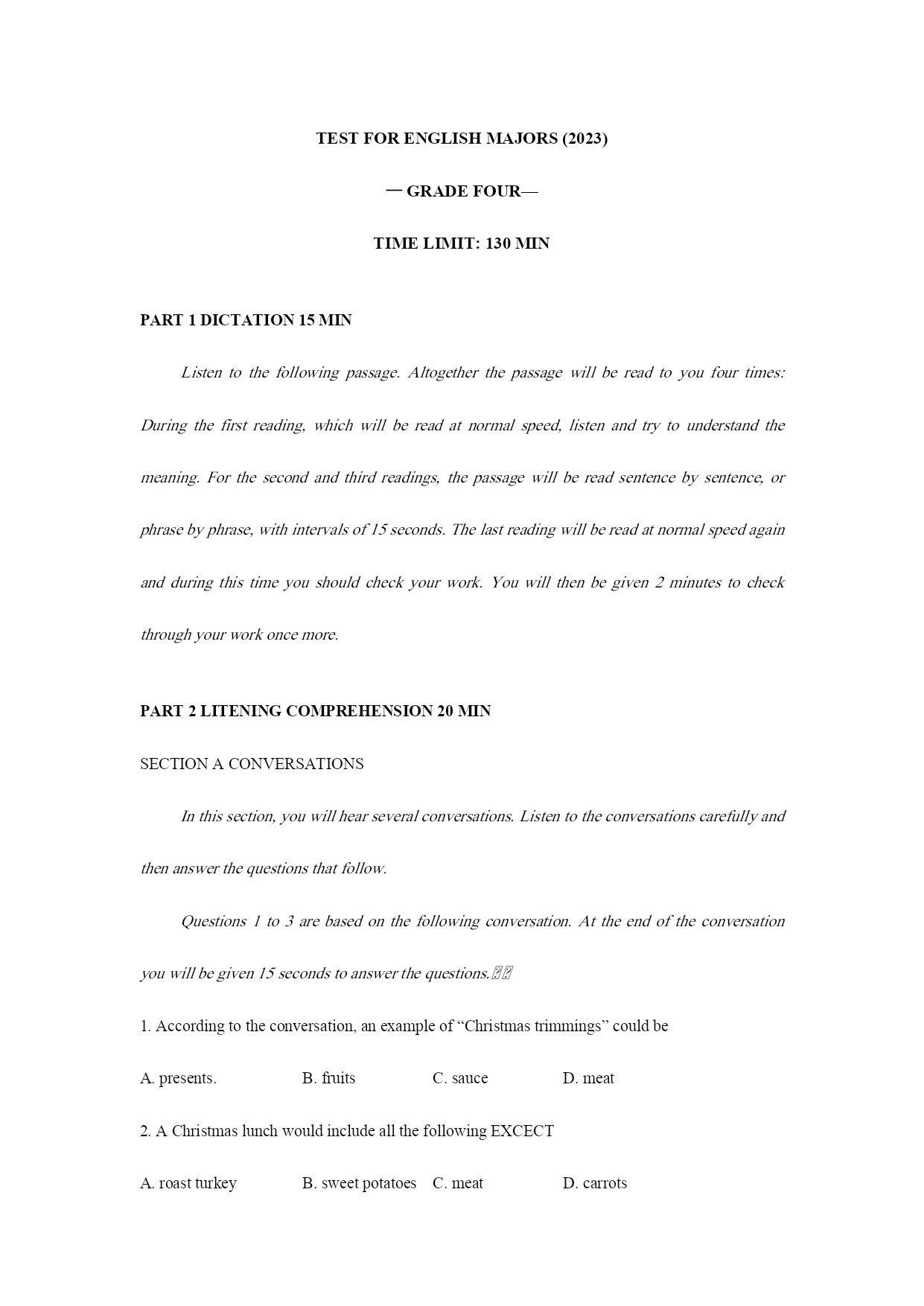 TESTFORENGLISHMAJORS(2023)—GRADEFOUR—TIMELIMIT:130MINPART1DICTATION15MINListentothefollowingpassage.Altogetherthepassagewillbereadtoyoufourtimes:Duringthefirstreading,whichwillbereadatnormalspeed,listenandtrytounderstandthemeaning.Forthesecondandthirdread