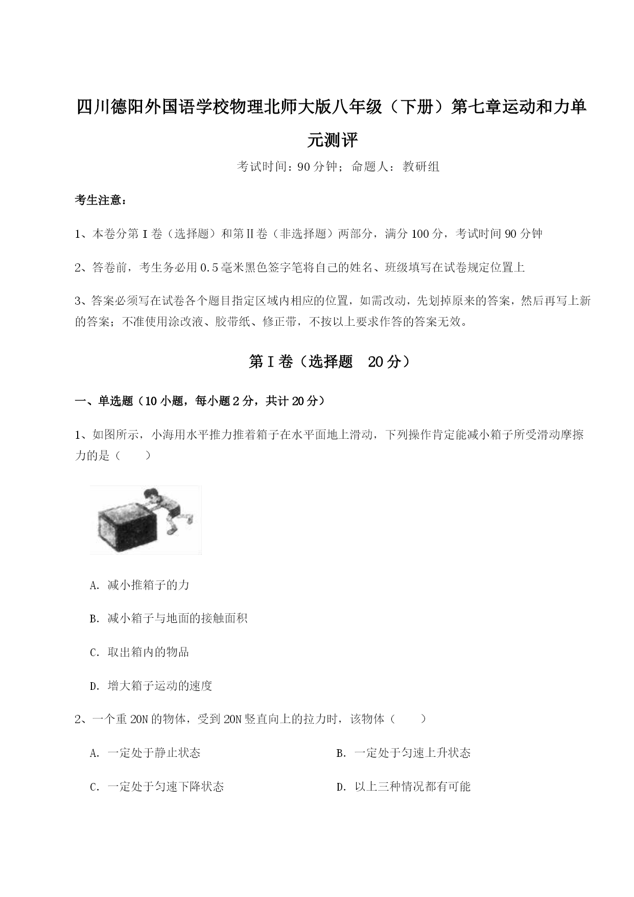四川德阳外国语学校物理北师大版八年级(下册)第七章运动和力单元测评考试时间:90分钟;命题人:教研组考生注意:1、本卷分第I卷(选择题)和第Ⅱ卷(非选择题)两部分,满分100分,考试时间90分钟2、答卷前,考生务必用0.5毫米黑色签字笔将自己的姓名、班级填写在试卷规定位置上3、答案必须写在试卷各个题目指定区域内相应的位置,如需改动,先划掉原来的答案,然后再写上新的答案;不准使用涂改液、胶带纸、修正带,不按以上要求作答的答案无效。第I卷(选择题20分)一、单选题(10小题,每小题2分,共计20分)1、如图所