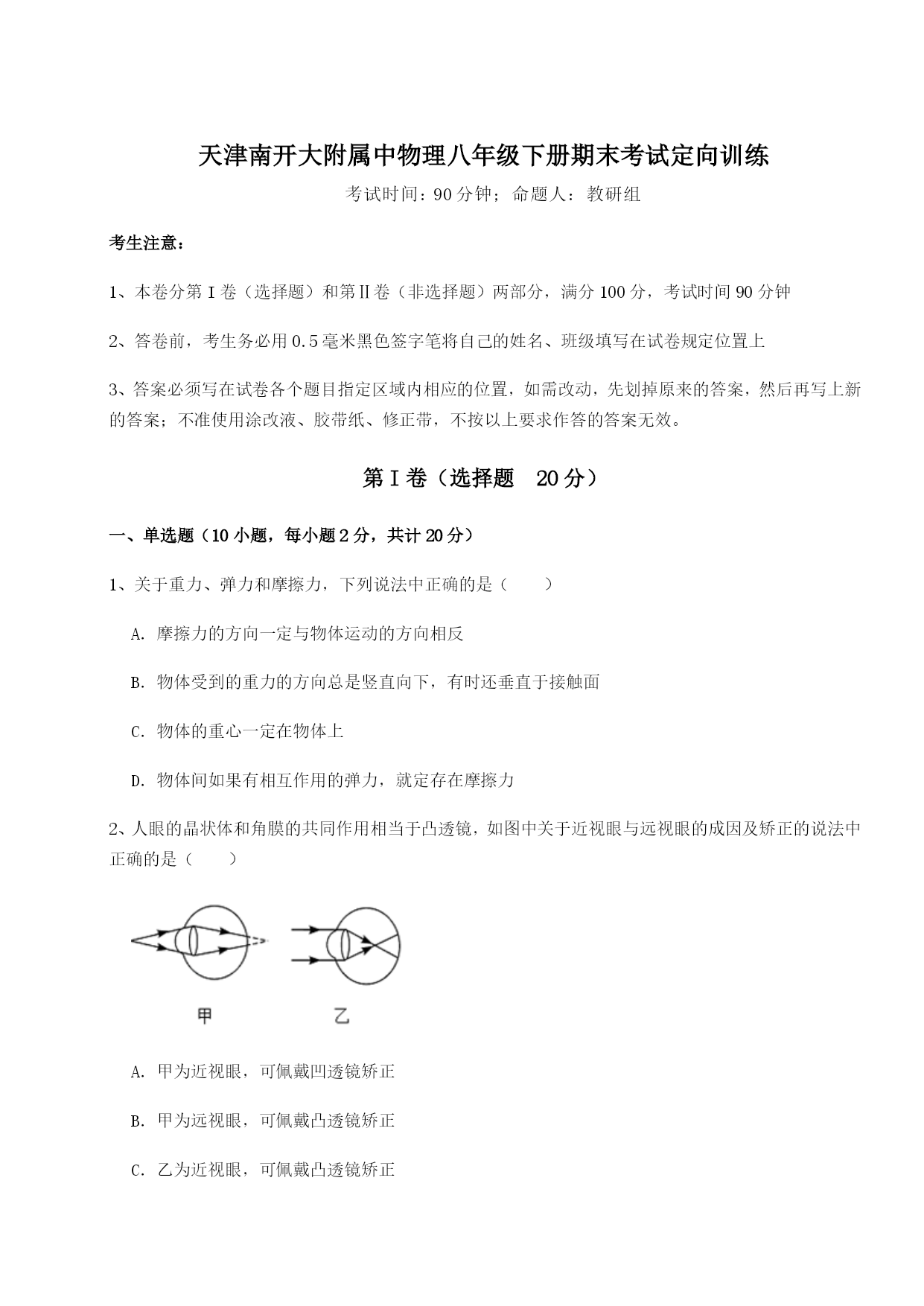 天津南开大附属中物理八年级下册期末考试定向训练考试时间:90分钟;命题人:教研组考生注意:1、本卷分第I卷(选择题)和第Ⅱ卷(非选择题)两部分,满分100分,考试时间90分钟2、答卷前,考生务必用0.5毫米黑色签字笔将自己的姓名、班级填写在试卷规定位置上3、答案必须写在试卷各个题目指定区域内相应的位置,如需改动,先划掉原来的答案,然后再写上新的答案;不准使用涂改液、胶带纸、修正带,不按以上要求作答的答案无效。第I卷(选择题20分)一、单选题(10小题,每小题2分,共计20分)1、关于重力、弹力和摩擦力,下