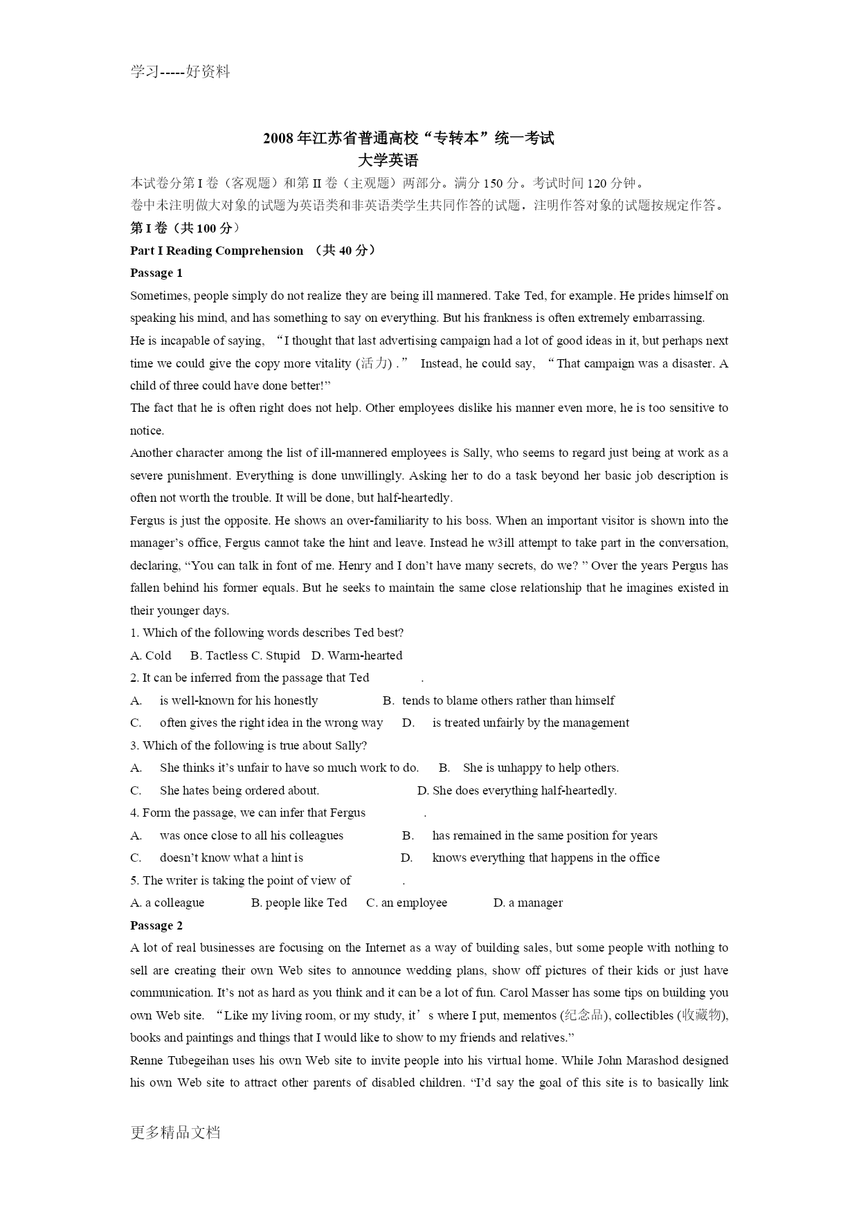 学习-----好资料学习-----好资料更多精品文档更多精品文档学习-----好资料更多精品文档2008年江苏省普通高校“专转本”统一考试大学英语本试卷分第I卷(客观题)和第II卷(主观题)两部分。满分150分。考试时间120分钟。卷中未注明做大对象的试题为英语类和非英语类学生共同作答的试题,注明作答对象的试题按规定作答。第I卷(共100分)PartIReadingComprehension(共40分)Passage1Sometimes,peoplesimplydonotrealizetheyarebei