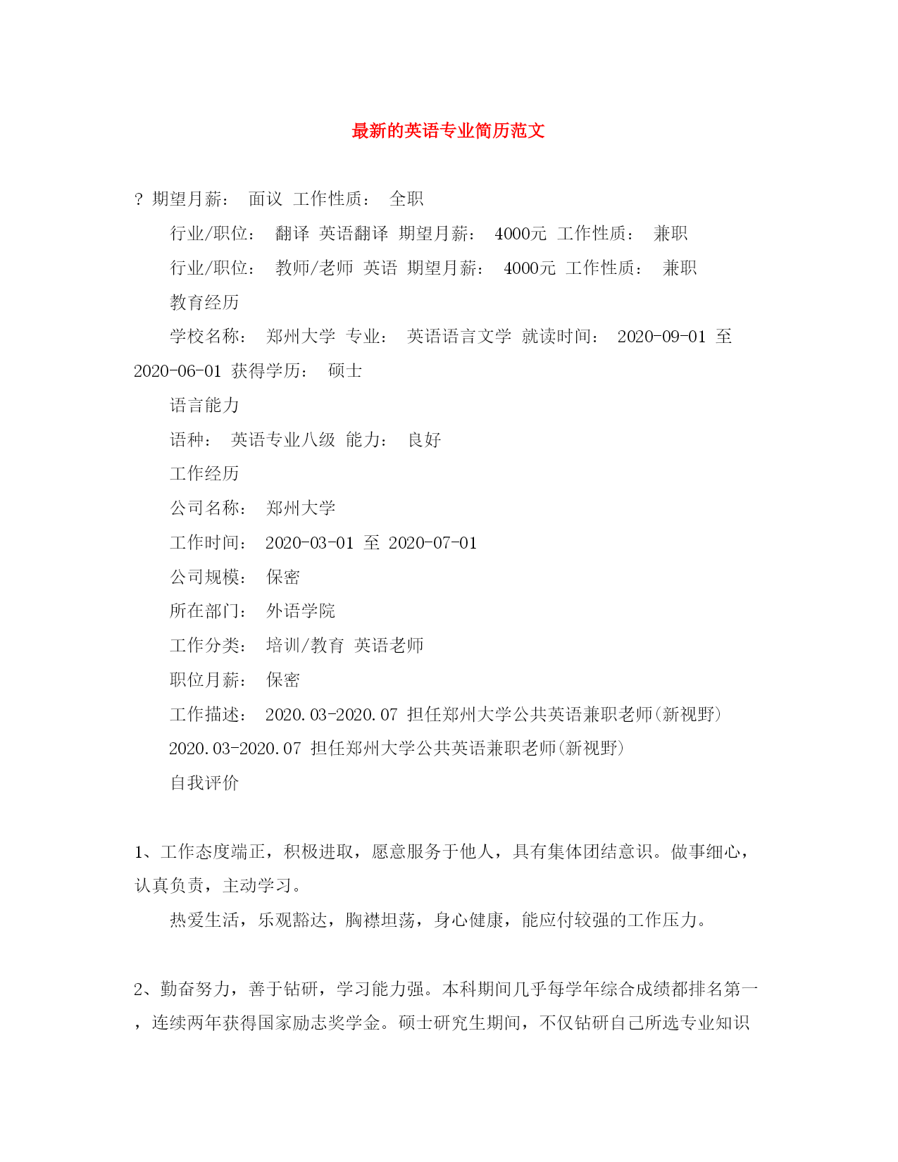 此资料由网络收集而来,如有侵权请告知上传者立即删除。资料共分享,我们负责传递知识。最新的英语专业简历范文?期望月薪:面议工作性质:全职行业/职位:翻译英语翻译期望月薪:4000元工作性质:兼职行业/职位:教师/老师英语期望月薪:4000元工作性质:兼职教育经历学校名称:郑州大学专业:英语语言文学就读时间:2020-09-01至2020-06-01获得学历:硕士语言能力语种:英语专业八级能力:良好工作经历公司名称:郑州大学工作时间:2020-03-01至2020-07-01公司规模:保密所在部门:外语学院工