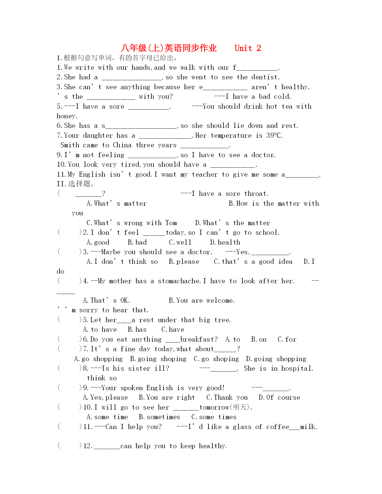 八年级(上)英语同步作业Unit2I.根据句意写单词,有的首字母已给出。1.Wewritewithourhands,andwewalkwithourf___________.2.Shehada________________,soshewenttoseethedentist.3.Shecan’tseeanythingbecausehere____________aren’thealthy.’sthe_____________withyou?---Ihaveabadcold.5.---Ihaveasore_