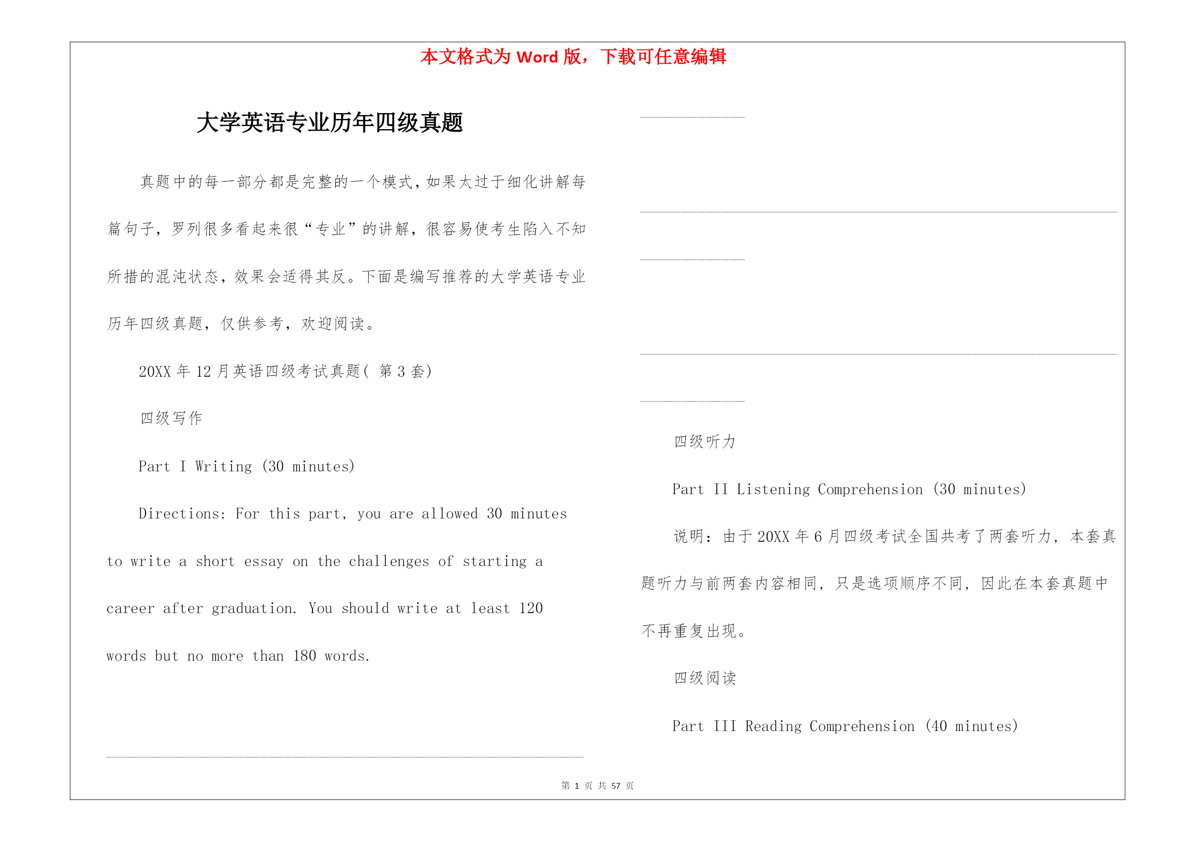 本文格式为Word版,下载可任意编辑第PAGE\*MERGEFORMAT57页共NUMPAGES\*MERGEFORMAT57页大学英语专业历年四级真题真题中的每一部分都是完整的一个模式,如果太过于细化讲解每篇句子,罗列很多看起来很“专业”的讲解,很容易使考生陷入不知所措的混沌状态,效果会适得其反。下面是编写推荐的大学英语专业历年四级真题,仅供参考,欢迎阅读。20XX年12月英语四级考试真题(第3套)四级写作PartIWriting(30minutes)Directions:Forthispa