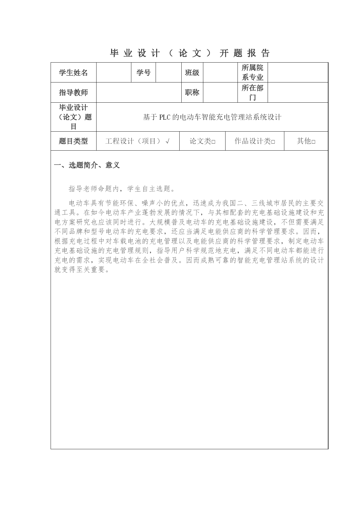 毕业设计(论文)开题报告学生姓名学号班级所属院系专业指导教师职称所在部门毕业设计(论文)题目基于PLC的电动车智能充电管理站系统设计题目类型工程设计(项目)√论文类□作品设计类□其他□选题简介、意义指导老师命题内,学生自主选题。电动车具有节能环保、噪声小的优点,迅速成为我国二、三线城市居民的主要交通工具。在如今电动车产业蓬勃发展的情况下,与其相配套的充电基础设施建设和充电方案研究也应该同时进行。大规模普及电动车的充电基础设施建设,不但需要满足不同品牌和型号电动车的充电要求,还应当满足电能供应商的科学管理要
