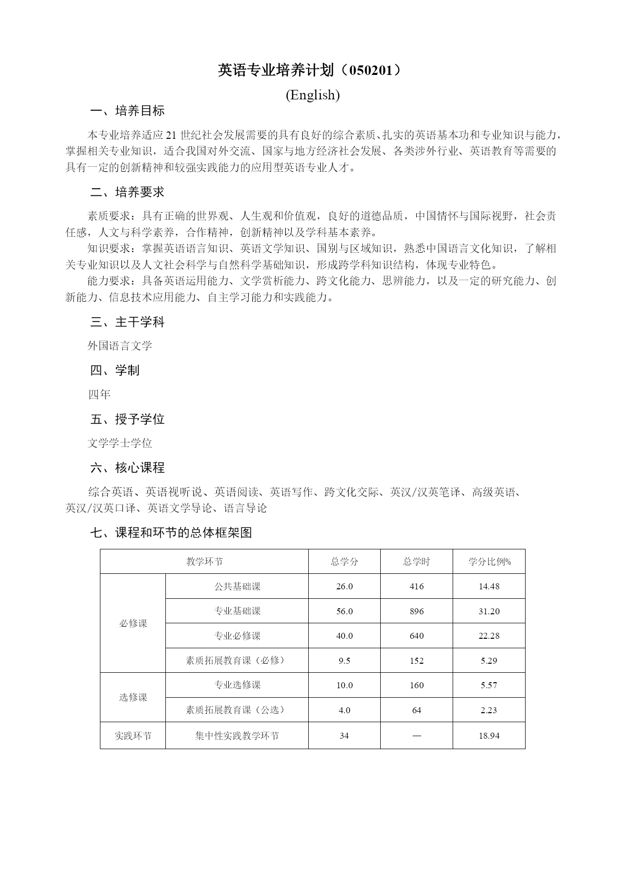 英语专业培养计划(050201)(English)一、培养目标本专业培养适应21世纪社会发展需要的具有良好的综合素质、扎实的英语基本功和专业知识与能力,掌握相关专业知识,适合我国对外交流、国家与地方经济社会发展、各类涉外行业、英语教育等需要的具有一定的创新精神和较强实践能力的应用型英语专业人才。二、培养要求素质要求:具有正确的世界观、人生观和价值观,良好的道德品质,中国情怀与国际视野,社会责任感,人文与科学素养,合作精神,创新精神以及学科基本素养。知识要求:掌握英语语言知识、英语文学知识、国别与区域知识,