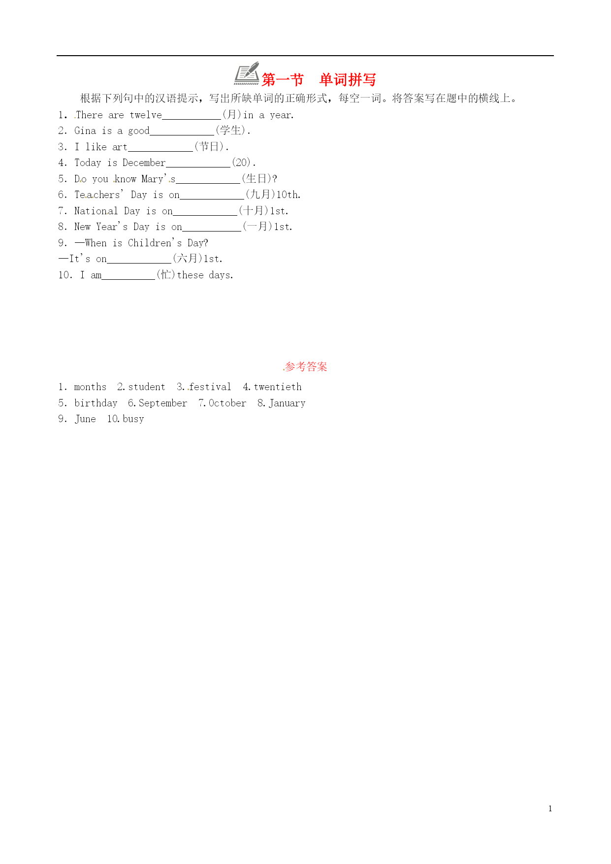 第一节单词拼写根据下列句中的汉语提示,写出所缺单词的正确形式,每空一词。将答案写在题中的横线上。1.Therearetwelve___________(月)inayear.2.Ginaisagood____________(学生).3.Ilikeart____________(节日).4.TodayisDecember____________(20).5.DoyouknowMary's____________(生日)?6.Teachers'Dayison____________(九月)10th.7.Nat
