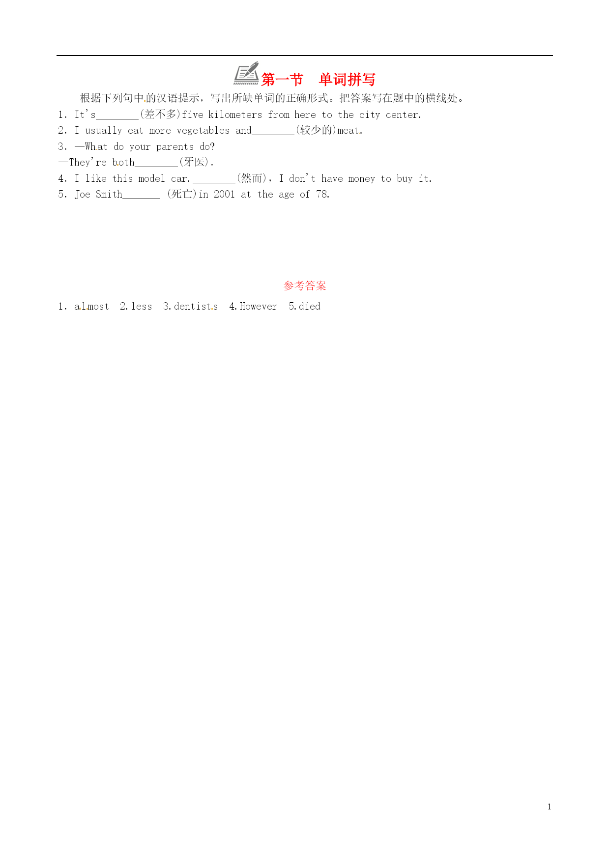 第一节单词拼写根据下列句中的汉语提示,写出所缺单词的正确形式。把答案写在题中的横线处。1.It's________(差不多)fivekilometersfromheretothecitycenter.2.Iusuallyeatmorevegetablesand________(较少的)meat.3.—Whatdoyourparentsdo?—They'reboth________(牙医).4.Ilikethismodelcar.________(然而),Idon'thavemoneytobuyit.5.J