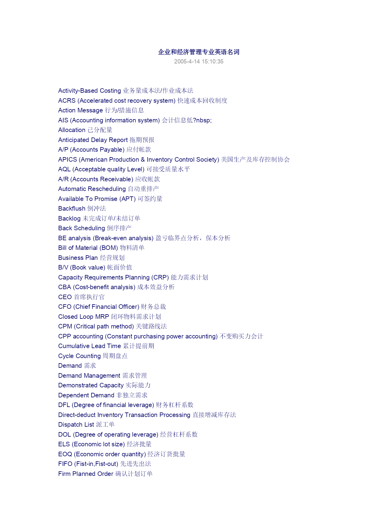 企业和经济管理专业英语名词2005-4-1415:10:35Activity-BasedCosting业务量成本法/作业成本法ACRS(Acceleratedcostrecoverysystem)快速成本回收制度ActionMessage行为/措施信息AIS(Accountinginformationsystem)会计信息低?nbsp;Allocation已分配量AnticipatedDelayReport拖期预报A/P(AccountsPayable)应付帐款APICS(AmericanProducti