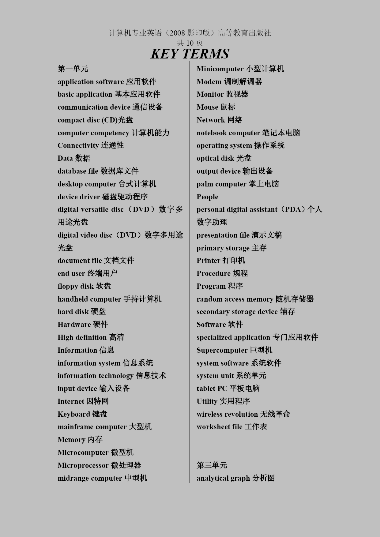 计算机专业英语(2008影印版)高等教育出版社KEYTERMS第一单元applicationsoftware应用软件basicapplication基本应用软件communicationdevice通信设备compactdisc(CD)光盘computercompetency计算机能力Connectivity连通性Data数据databasefile数据库文件desktopcomputer台式计算机devicedriver磁盘驱动程序digitalversatiledisc(DVD)数字多用途光盘digi