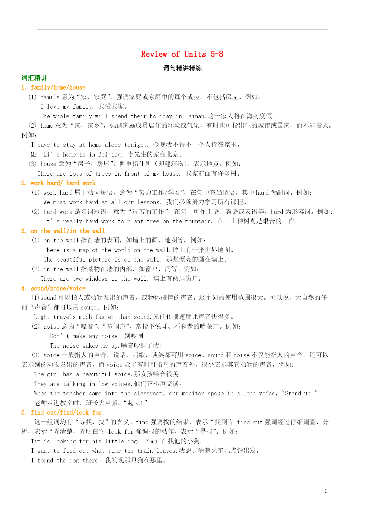 ReviewofUnits5-8词句精讲精练词汇精讲1.family/home/house(1)family意为“家,家庭”,强调家庭或家庭中的每个成员,不包括房屋。例如:Ilovemyfamily.我爱我家。ThewholefamilywillspendtheirholidayinHainan.这一家人将在海南度假。(2)home意为“家,家乡”,强调家庭成员居住的环境或气氛,有时也可指出生的城市或国家,而不能指人。例如:Ihavetostayathomealonetonight.今晚我不得不一个人待在