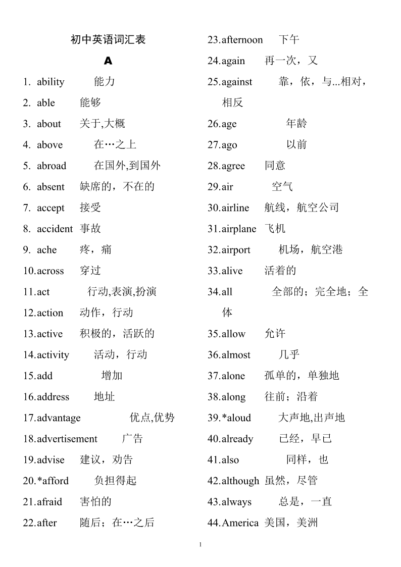 初中英语词汇表23.afternoon下午A24.again再一次,又1.ability能力25.against靠,依,与...相对,2.able能够相反3.about关于,大概26.age年龄4.above在…之上27.ago以前5.abroad在国外,到国外28.agree同意6.absent缺席的,不在的29.air空气7.accept接受30.airline航线,航空公司8.accident事故31.airplane飞机9.ache疼,痛32.airport机场,航空港10.across穿过33.