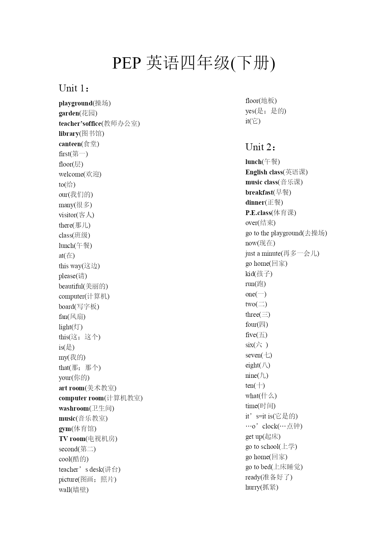 PEP英语四年级(下册)floor(地板)yes(是;是的)it(它)Unit2:lunch(午餐)Englishclass(英语课)musicclass(音乐课)breakfast(早餐)dinner(正餐)P.E.class(体育课)over(结束)gototheplayground(去操场)now(现在)justaminute(再多一会儿)gohome(回家)kid(孩子)run(跑)one(一)two(二)three(三)four(四)five(五)six(六)seven(七)eight(八)ni
