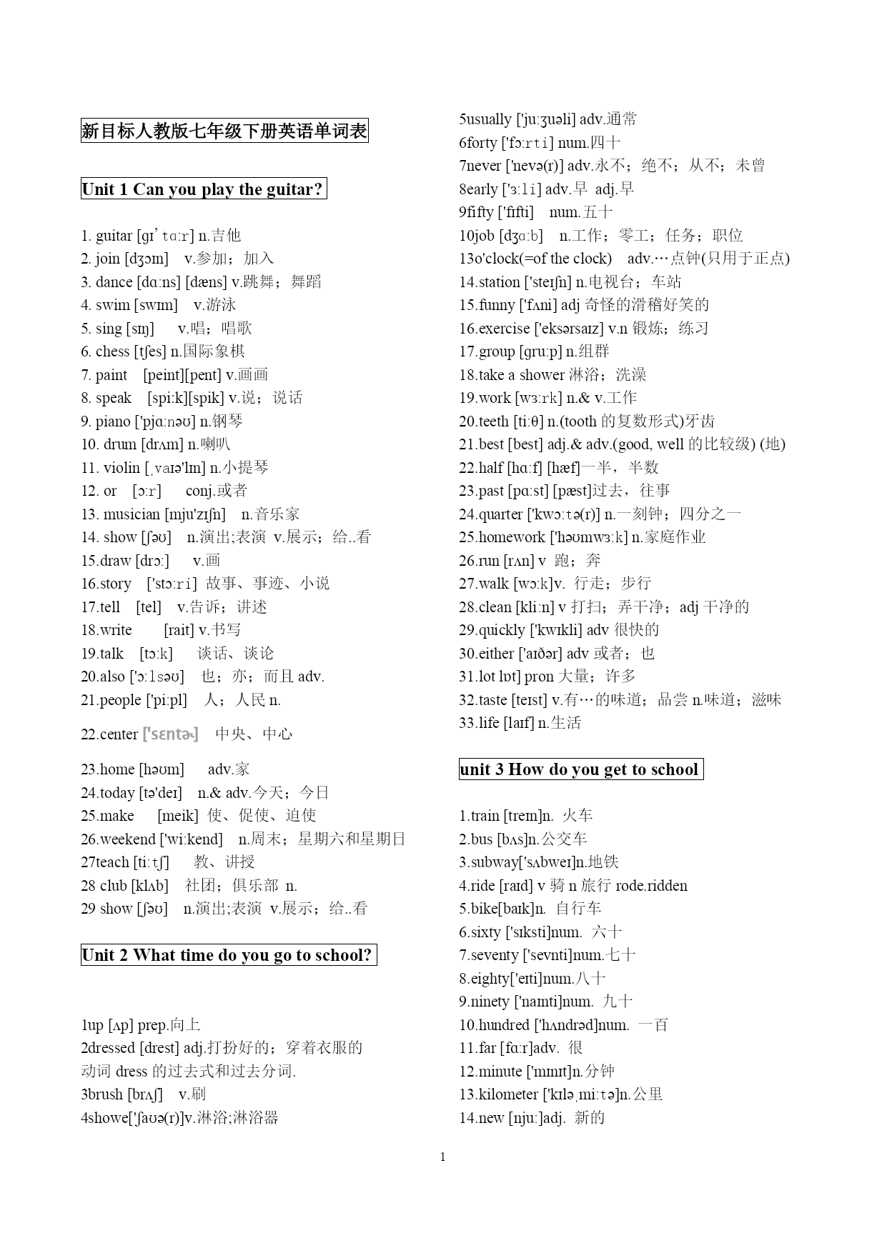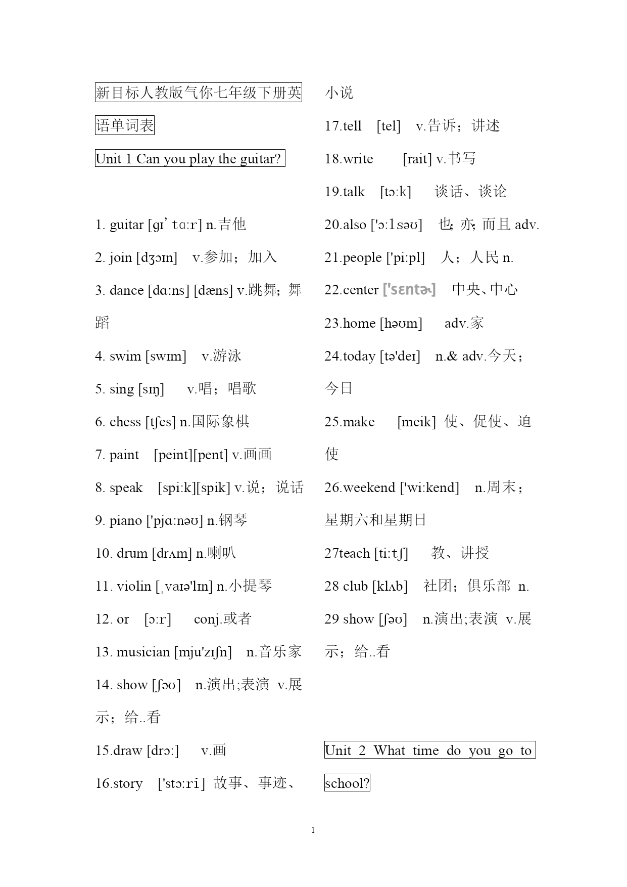 新目标人教版气你七年级下册英语单词表Unit1Canyouplaytheguitar?1.guitar[ɡɪ'tɑːr]n.吉他2.join[dʒɔɪn]v.参加;加入3.dance[dɑːns][dæns]v.跳舞;舞蹈4.swim[swɪm]v.游泳5.sing[sɪŋ]v.唱;唱歌6.chess[tʃes]n.国际象棋7.paint[peint][pent]v.画画8.speak[spi:k][spik]v.说;说话9.piano['pjɑːnəʊ]n.钢琴10.drum[drʌm]n.喇叭11.v