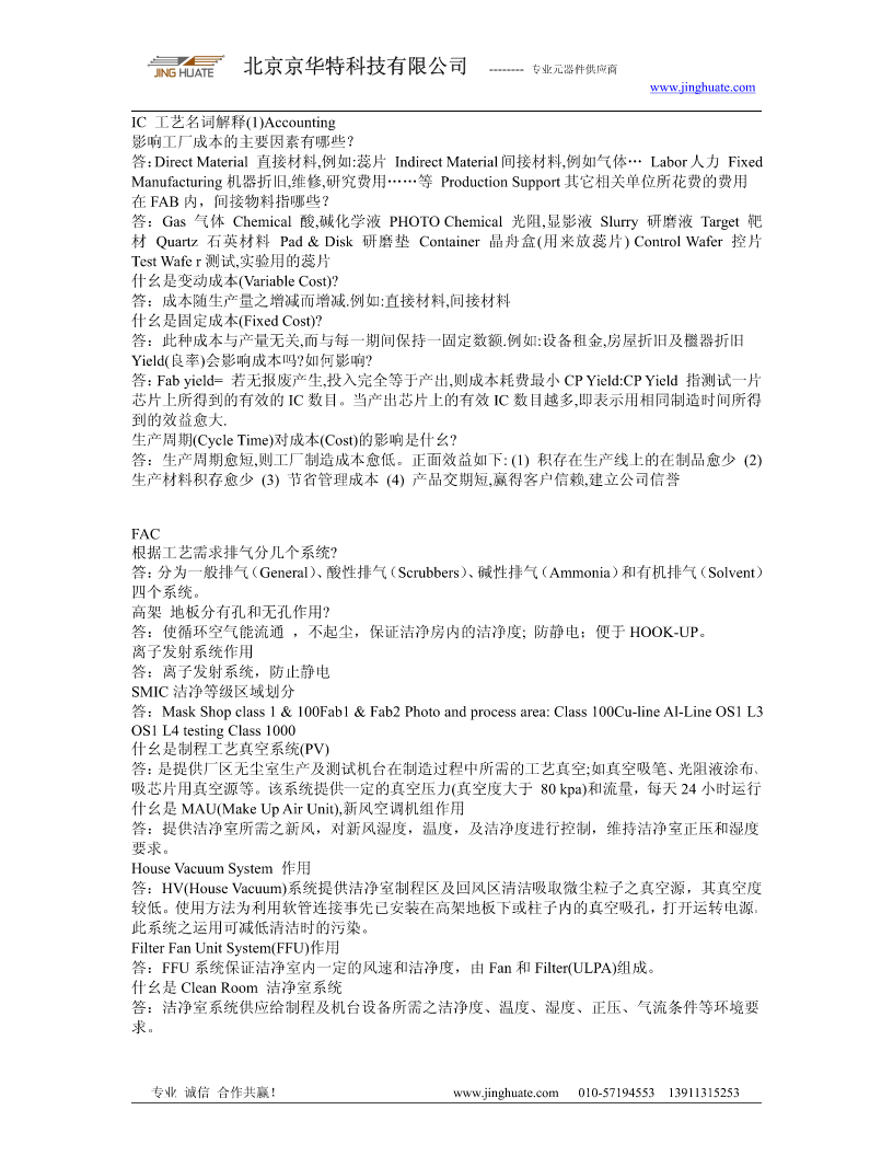 北京京华特科技有限公司--------专业元器件供应商www.jinghuate.comIC工(1)Accounting艺名词解释影响工厂成本的主要因素有哪些?答:DirectMaterial直,例如:蕊片Indirect接材Material间,例…Labo接材r人力如气Fixed料料体Manufacturing机,维修,研器折……等Production究费Support其旧它相用关单位所花费的费用在FAB内,间接物料指哪些?答:Gas气体Chemical酸,碱化学液PHOTOChemical光阻,显影液