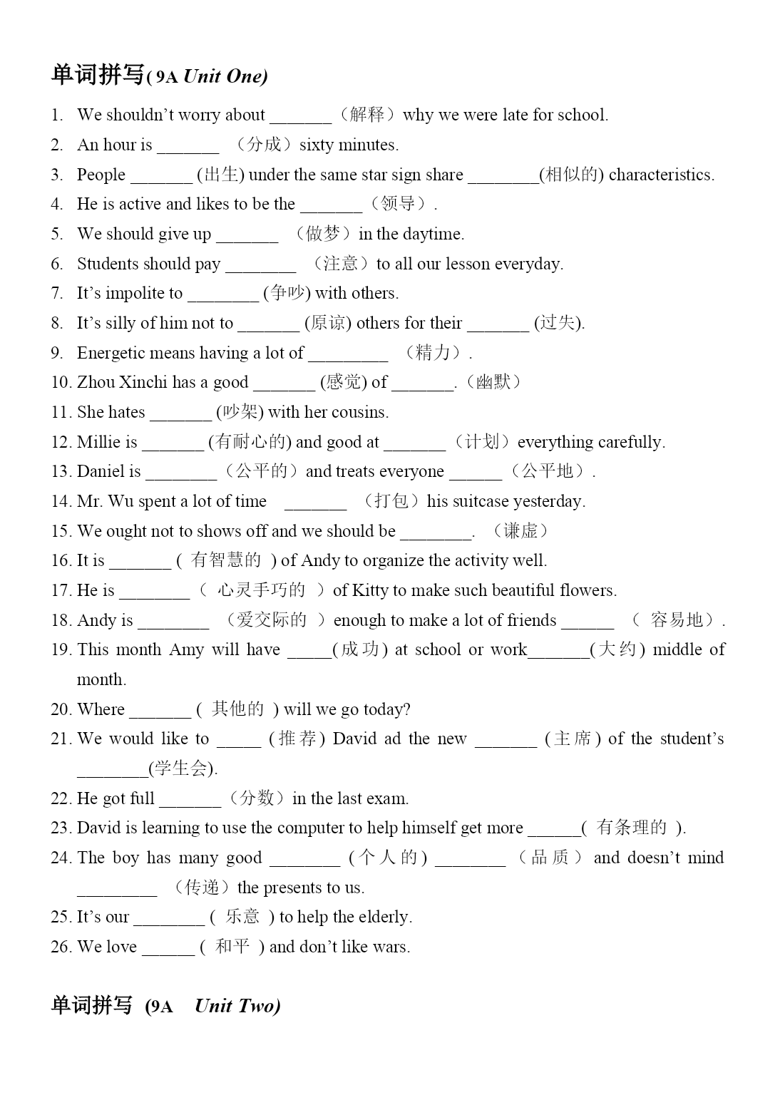 单词拼写(9AUnitOne)Weshouldn’tworryabout_______(解释)whywewerelateforschool.Anhouris_______(分成)sixtyminutes.People_______(出生)underthesamestarsignshare________(相似的)characteristics.Heisactiveandlikestobethe_______(领导).Weshouldgiveup_______(做梦)inthedaytime.Student